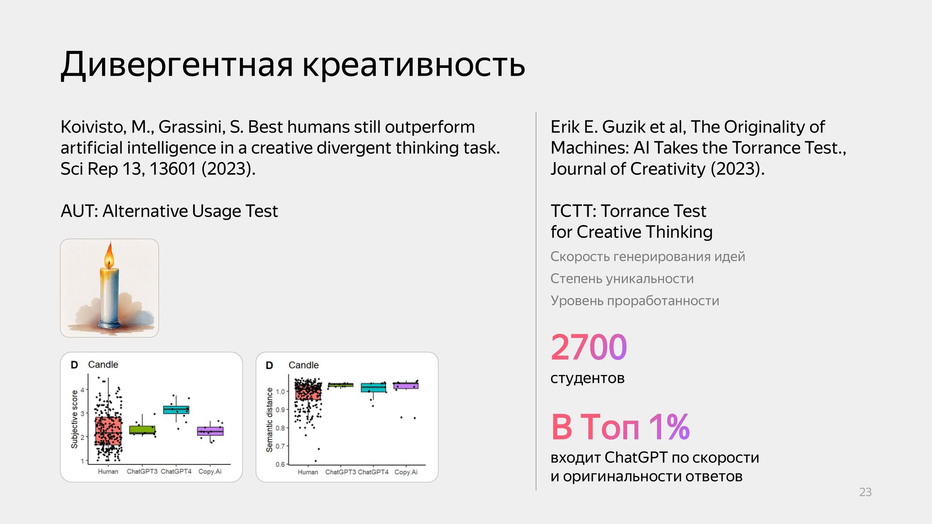 outperform artificial intelligence in a creative divergent thinking task. Sci Rep 13, 13601 (2023). AUT: Alternative Usage Test Erik E. Guzik et al, The Originality of Machines: AI Takes the Torrance Test., Journal of Creativity (2023). TCTT: Torrance Test for Creative Thinking Скорость генерирования идей Степень уникальности Уровень проработанности 2700 студентов В Топ 1% входит ChatGPT по скорости и оригинальности ответов