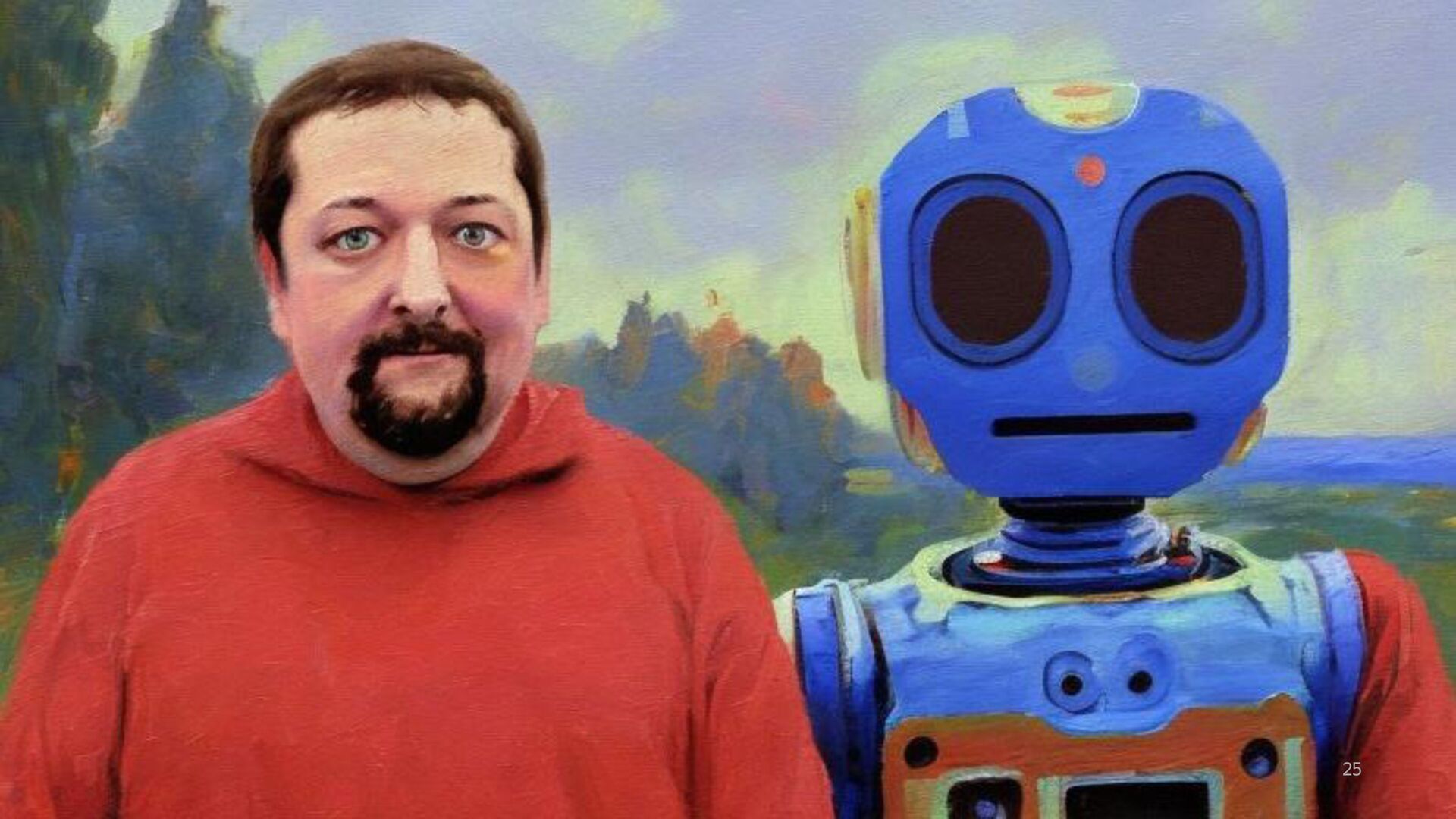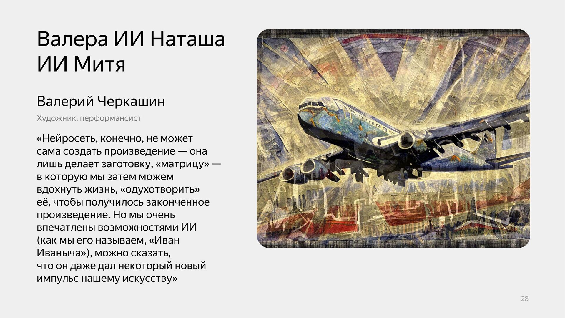 «Нейросеть, конечно, не может сама создать произведение — она лишь делает заготовку, «матрицу» — в которую мы затем можем вдохнуть жизнь, «одухотворить» её, чтобы получилось законченное произведение. Но мы очень впечатлены возможностями ИИ (как мы его называем, «Иван Иваныча»), можно сказать, что он даже дал некоторый новый импульс нашему искусству»