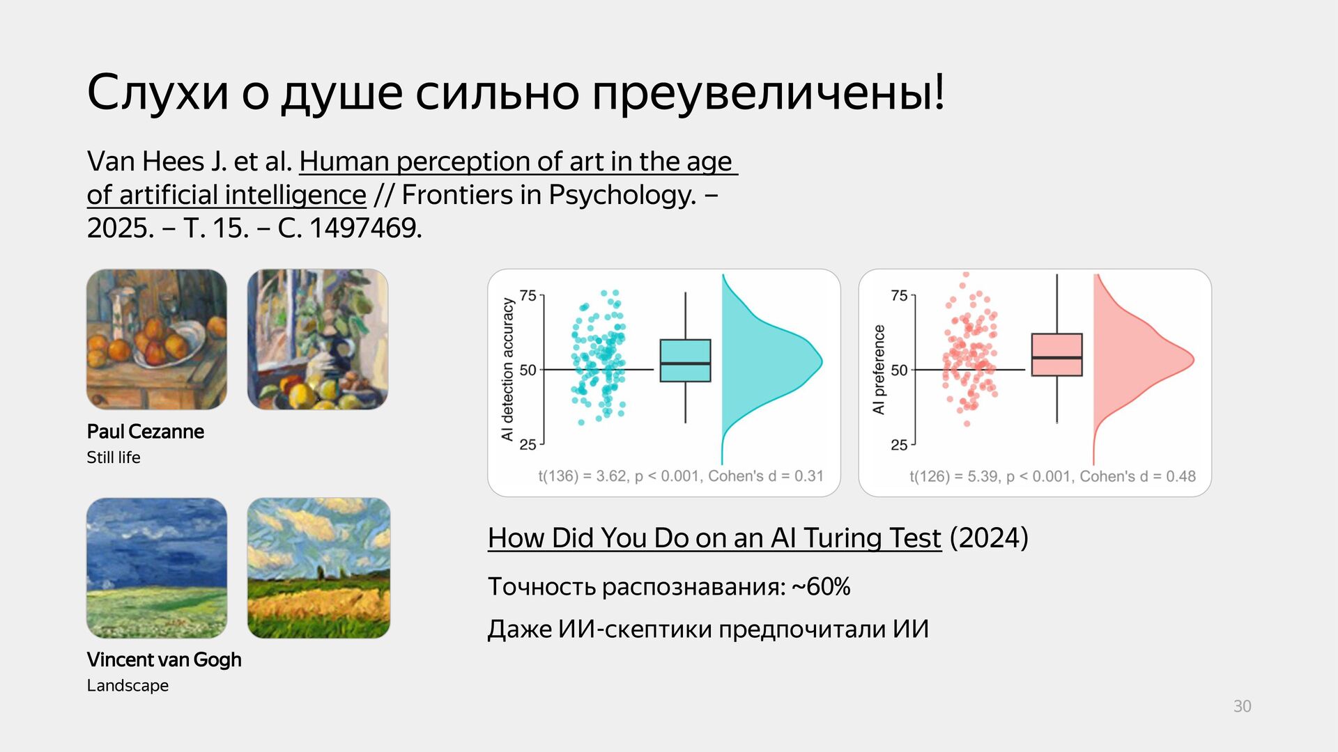 al. Human perception of art in the age of artificial intelligence // Frontiers in Psychology. – 2025. – Т. 15. – С. 1497469. Paul Cezanne Still life Vincent van Gogh Landscape How Did You Do on an AI Turing Test (2024) Точность распознавания: ~60% Даже ИИ-скептики предпочитали ИИ