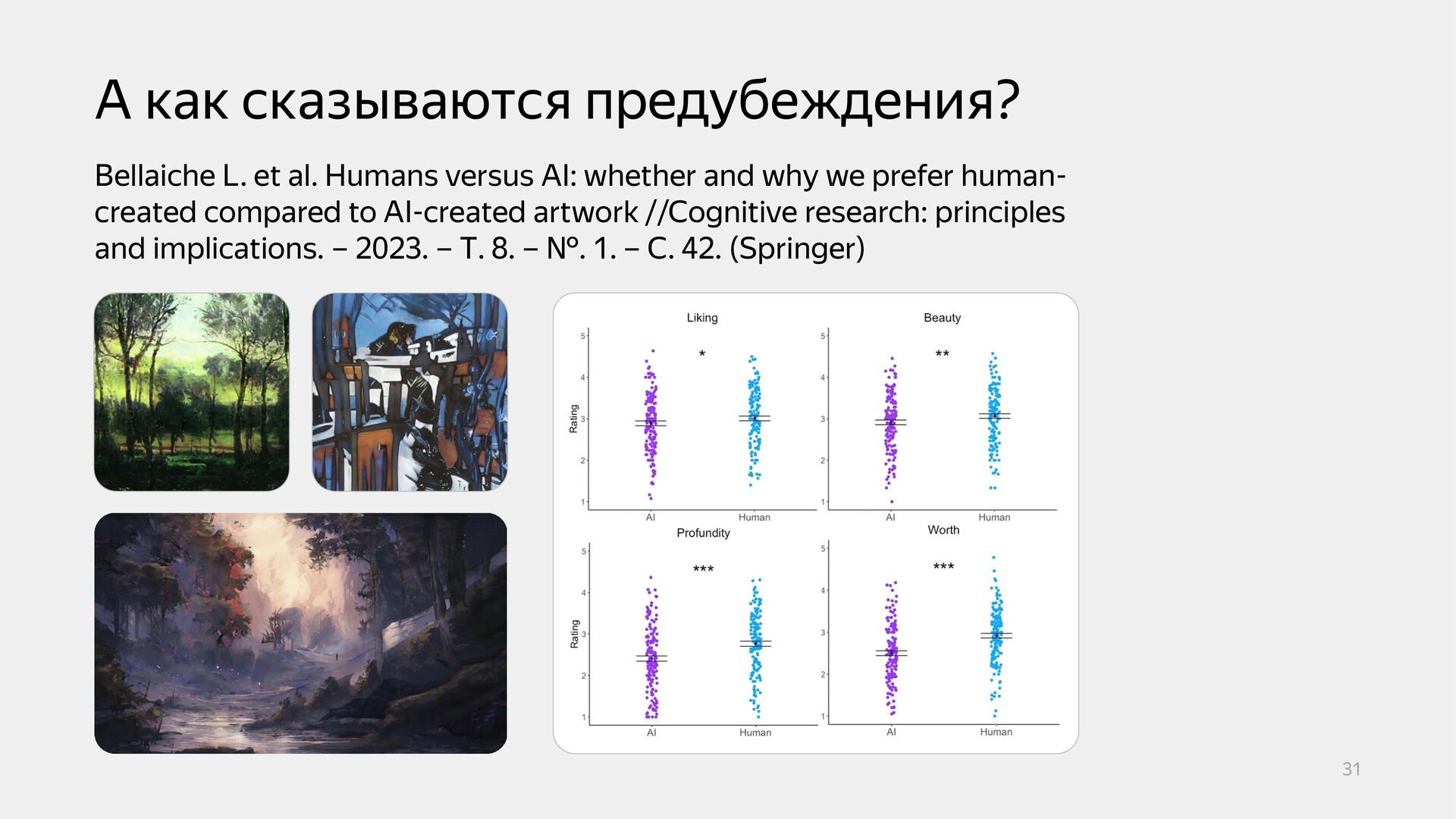 versus AI: whether and why we prefer human- created compared to AI-created artwork //Cognitive research: principles and implications. – 2023. – Т. 8. – №. 1. – С. 42. (Springer)