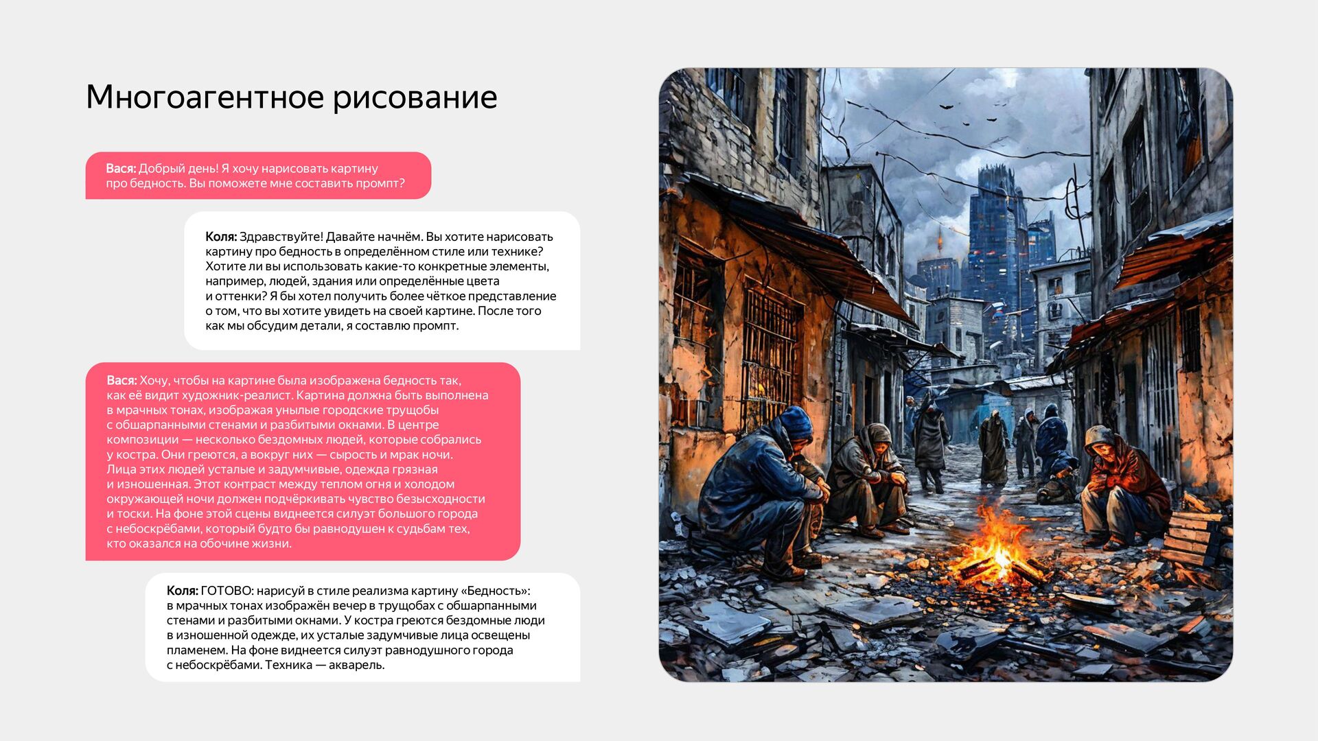 бедность. Вы поможете мне составить промпт? Коля: Здравствуйте! Давайте начнём. Вы хотите нарисовать картину про бедность в определённом стиле или технике? Хотите ли вы использовать какие-то конкретные элементы, например, людей, здания или определённые цвета и оттенки? Я бы хотел получить более чёткое представление о том, что вы хотите увидеть на своей картине. После того как мы обсудим детали, я составлю промпт. Вася: Хочу, чтобы на картине была изображена бедность так, как её видит художник-реалист. Картина должна быть выполнена в мрачных тонах, изображая унылые городские трущобы с обшарпанными стенами и разбитыми окнами. В центре композиции — несколько бездомных людей, которые собрались у костра. Они греются, а вокруг них — сырость и мрак ночи. Лица этих людей усталые и задумчивые, одежда грязная и изношенная. Этот контраст между теплом огня и холодом окружающей ночи должен подчёркивать чувство безысходности и тоски. На фоне этой сцены виднеется силуэт большого города с небоскрёбами, который будто бы равнодушен к судьбам тех, кто оказался на обочине жизни. Коля: ГОТОВО: нарисуй в стиле реализма картину «Бедность»: в мрачных тонах изображён вечер в трущобах с обшарпанными стенами и разбитыми окнами. У костра греются бездомные люди в изношенной одежде, их усталые задумчивые лица освещены пламенем. На фоне виднеется силуэт равнодушного города с небоскрёбами. Техника — акварель.