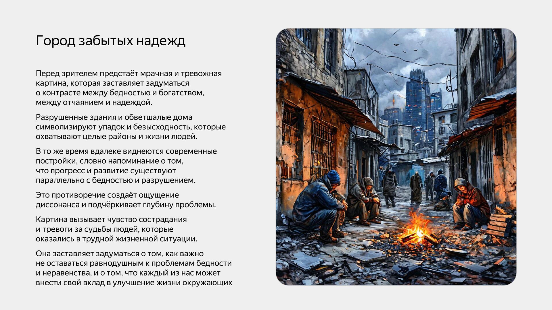 которая заставляет задуматься о контрасте между бедностью и богатством, между отчаянием и надеждой. Разрушенные здания и обветшалые дома символизируют упадок и безысходность, которые охватывают целые районы и жизни людей. В то же время вдалеке виднеются современные постройки, словно напоминание о том, что прогресс и развитие существуют параллельно с бедностью и разрушением. Это противоречие создаёт ощущение диссонанса и подчёркивает глубину проблемы. Картина вызывает чувство сострадания и тревоги за судьбы людей, которые оказались в трудной жизненной ситуации. Она заставляет задуматься о том, как важно не оставаться равнодушным к проблемам бедности и неравенства, и о том, что каждый из нас может внести свой вклад в улучшение жизни окружающих