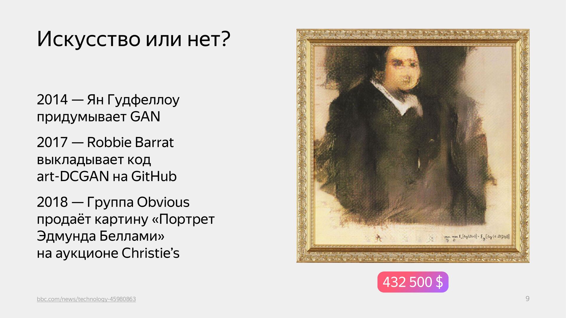 GAN 2017 — Robbie Barrat выкладывает код art-DCGAN на GitHub 2018 — Группа Obvious продаёт картину «Портрет Эдмунда Беллами» на аукционе Christie’s 432 500 $