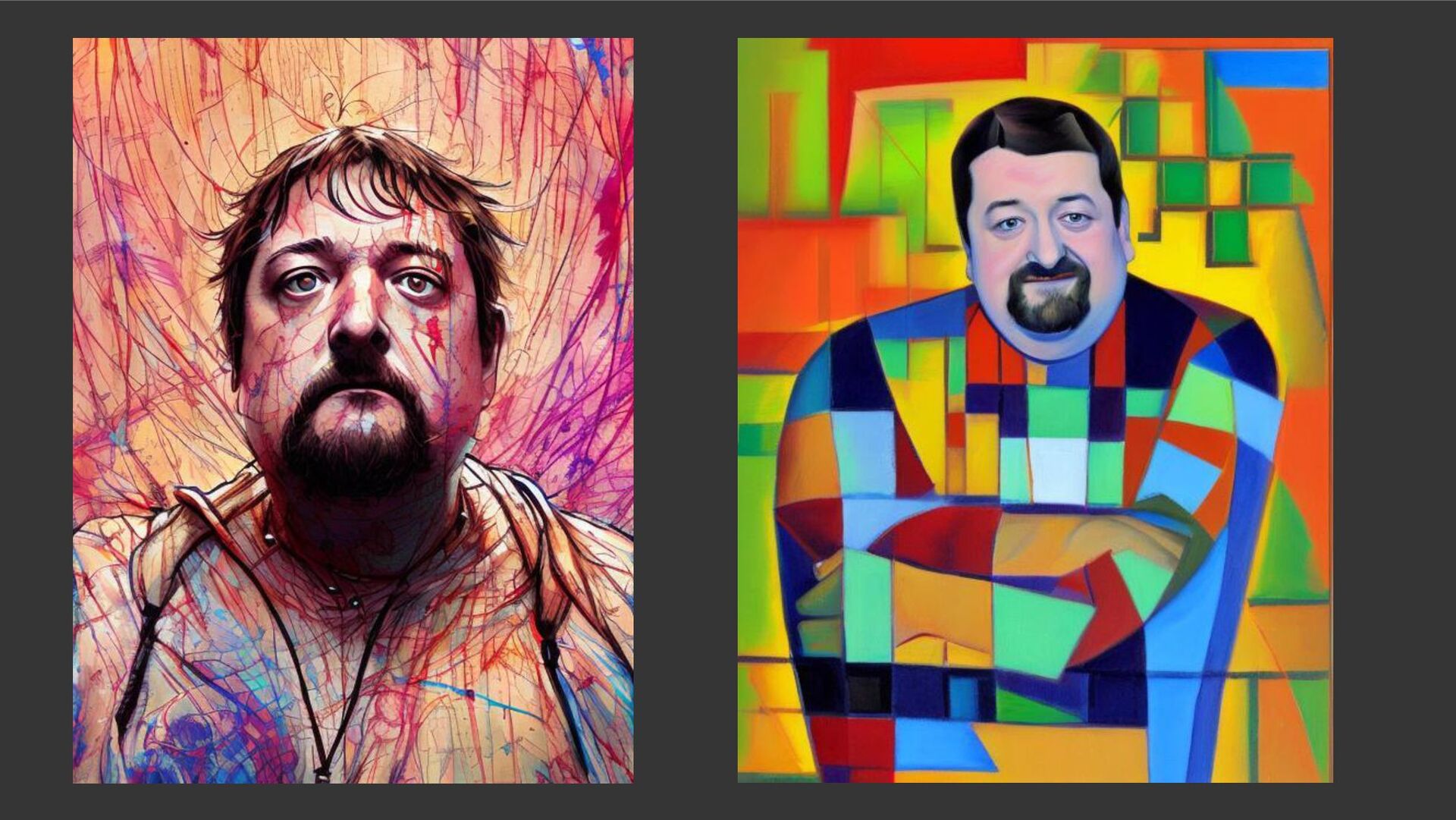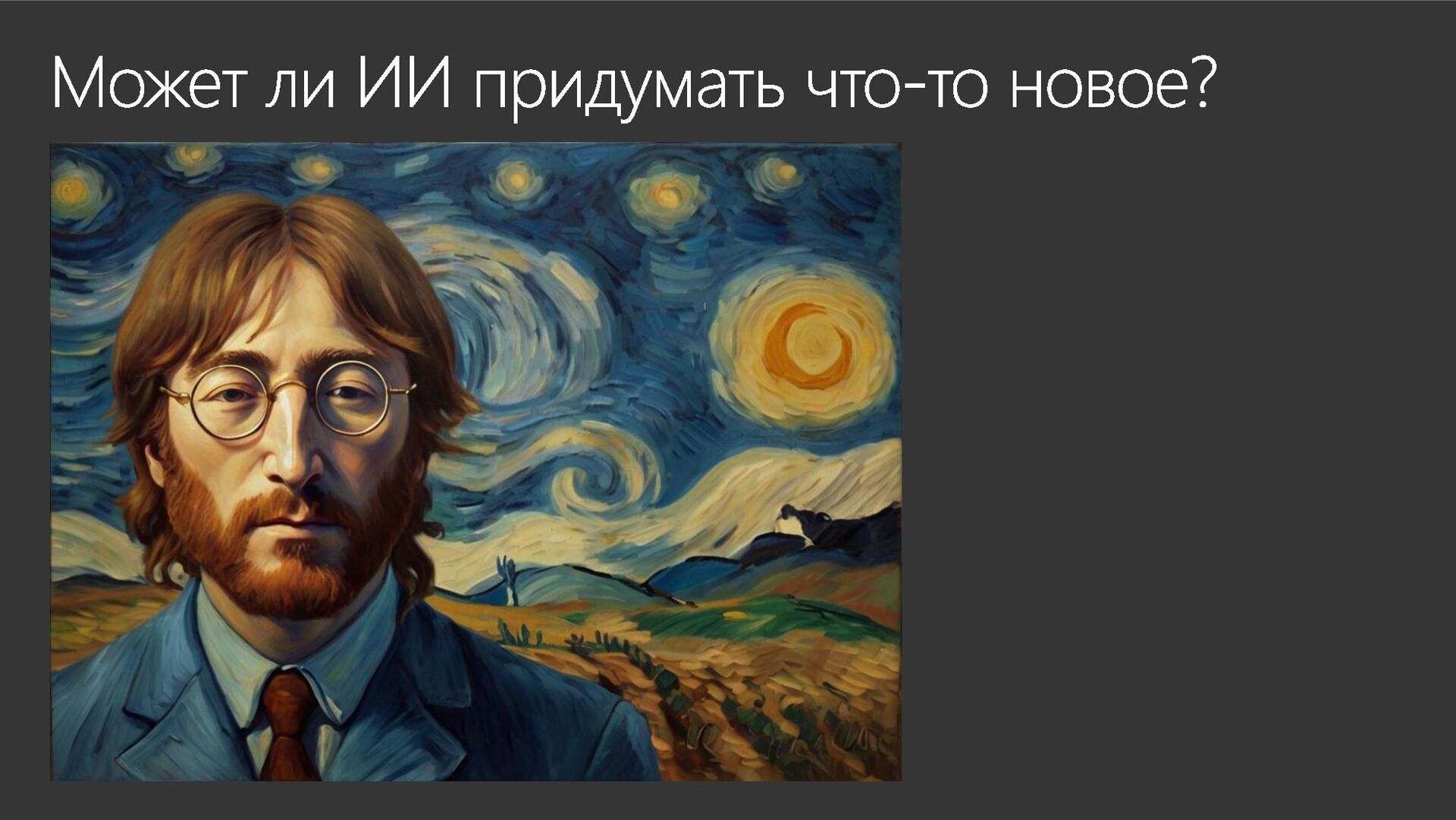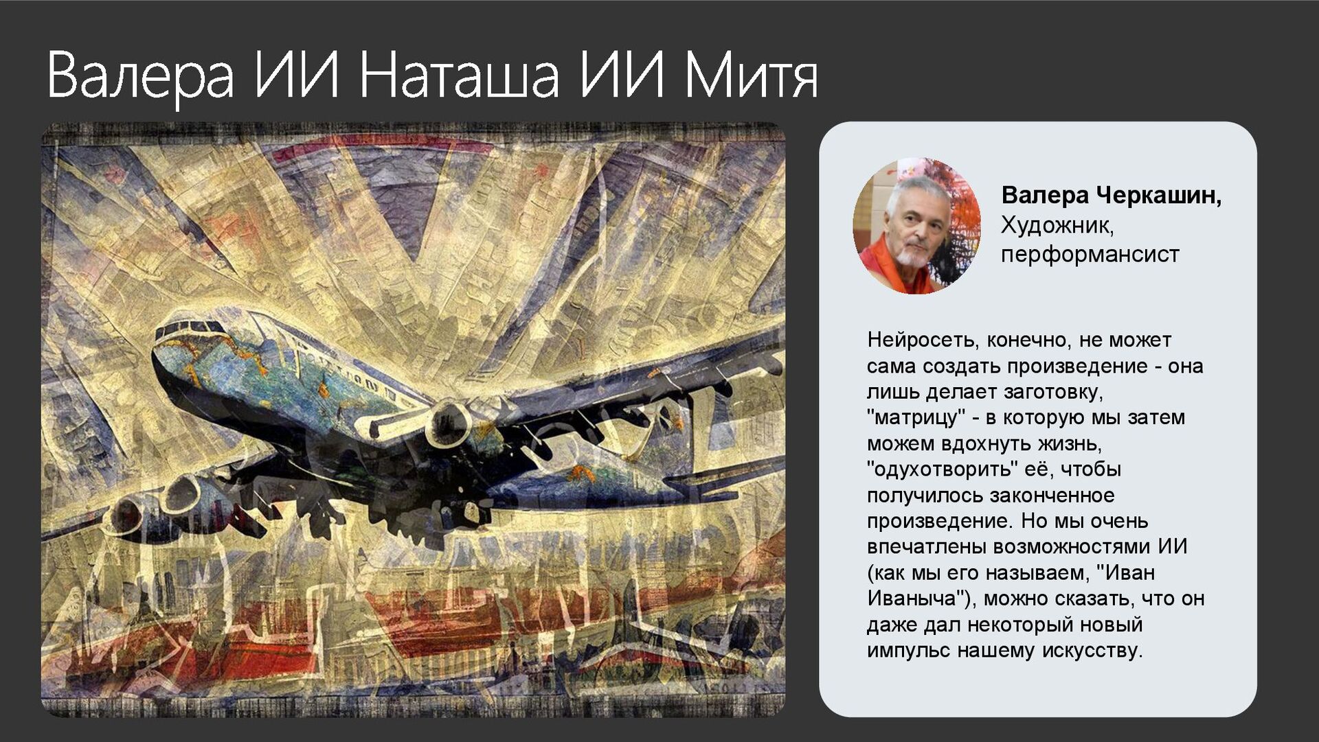 создать произведение - она лишь делает заготовку, "матрицу" - в которую мы затем можем вдохнуть жизнь, "одухотворить" её, чтобы получилось законченное произведение. Но мы очень впечатлены возможностями ИИ (как мы его называем, "Иван Иваныча"), можно сказать, что он даже дал некоторый новый импульс нашему искусству. Валера Черкашин, Художник, перформансист
