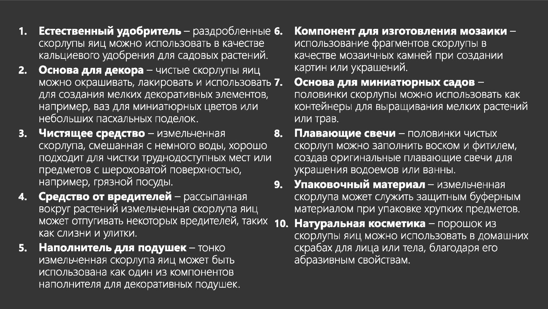 кальциевого удобрения для садовых растений. Основа для декора – чистые скорлупы яиц можно окрашивать, лакировать и использовать для создания мелких декоративных элементов, например, ваз для миниатюрных цветов или небольших пасхальных поделок. Чистящее средство – измельченная скорлупа, смешанная с немного воды, хорошо подходит для чистки труднодоступных мест или предметов с шероховатой поверхностью, например, грязной посуды. Средство от вредителей – рассыпанная вокруг растений измельченная скорлупа яиц может отпугивать некоторых вредителей, таких как слизни и улитки. Наполнитель для подушек – тонко измельченная скорлупа яиц может быть использована как один из компонентов наполнителя для декоративных подушек. Компонент для изготовления мозаики – использование фрагментов скорлупы в качестве мозаичных камней при создании картин или украшений. Основа для миниатюрных садов – половинки скорлупы можно использовать как контейнеры для выращивания мелких растений или трав. Плавающие свечи – половинки чистых скорлуп можно заполнить воском и фитилем, создав оригинальные плавающие свечи для украшения водоемов или ванны. Упаковочный материал – измельченная скорлупа может служить защитным буферным материалом при упаковке хрупких предметов. Натуральная косметика – порошок из скорлупы яиц можно использовать в домашних скрабах для лица или тела, благодаря его абразивным свойствам.