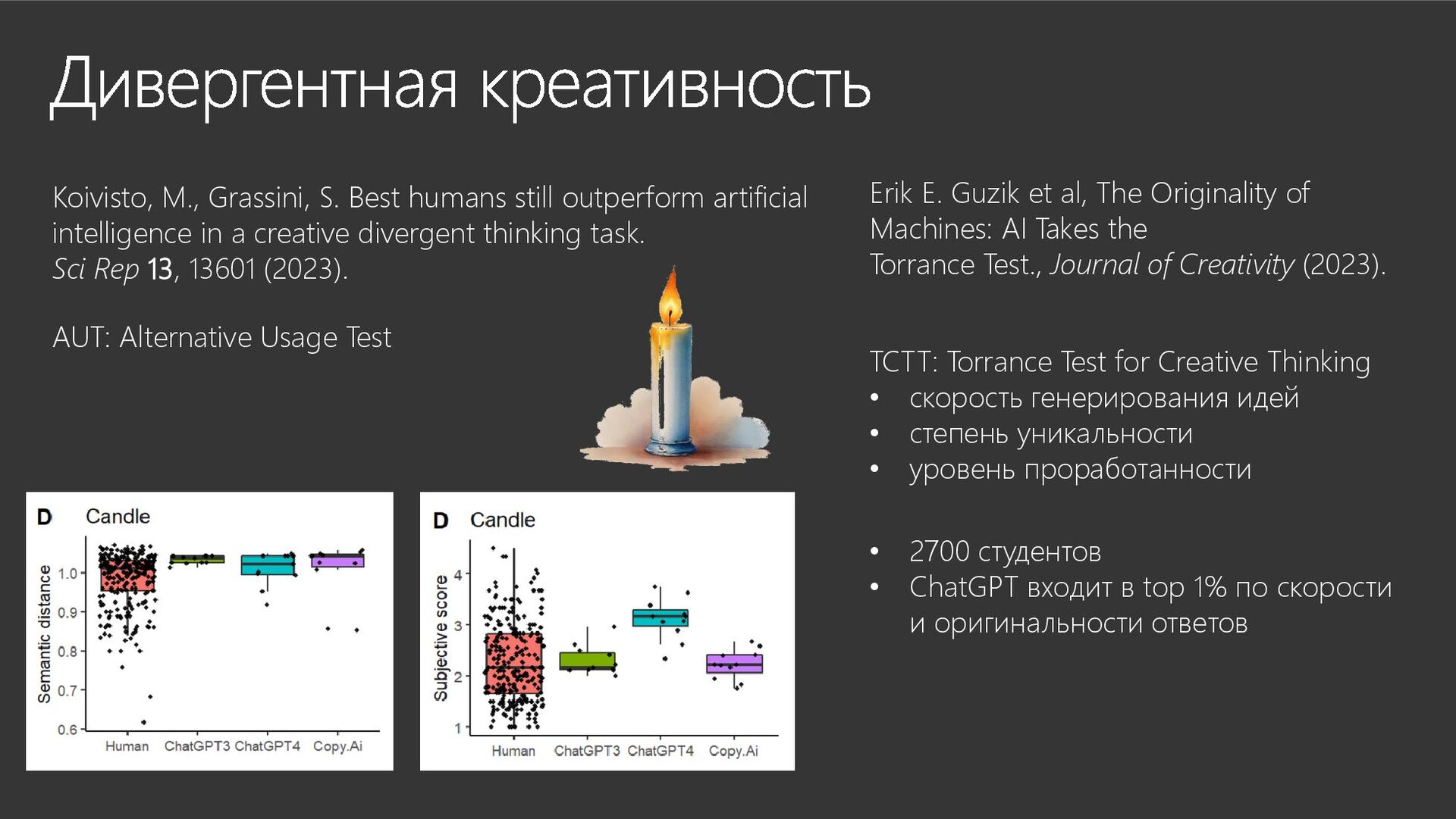 Best humans still outperform artificial intelligence in a creative divergent thinking task. Sci Rep 13, 13601 (2023). TCTT: Torrance Test for Creative Thinking • скорость генерирования идей • степень уникальности • уровень проработанности Erik E. Guzik et al, The Originality of Machines: AI Takes the Torrance Test., Journal of Creativity (2023). • 2700 студентов • ChatGPT входит в top 1% по скорости и оригинальности ответов