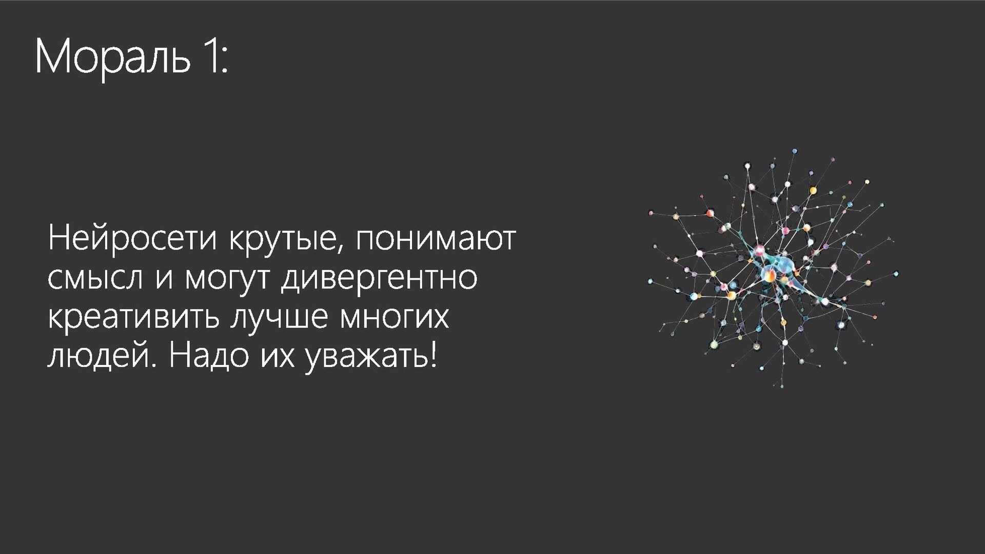 26. Мораль Нейросети крутые, понимают смысл и могут дивергентно креативить лучше