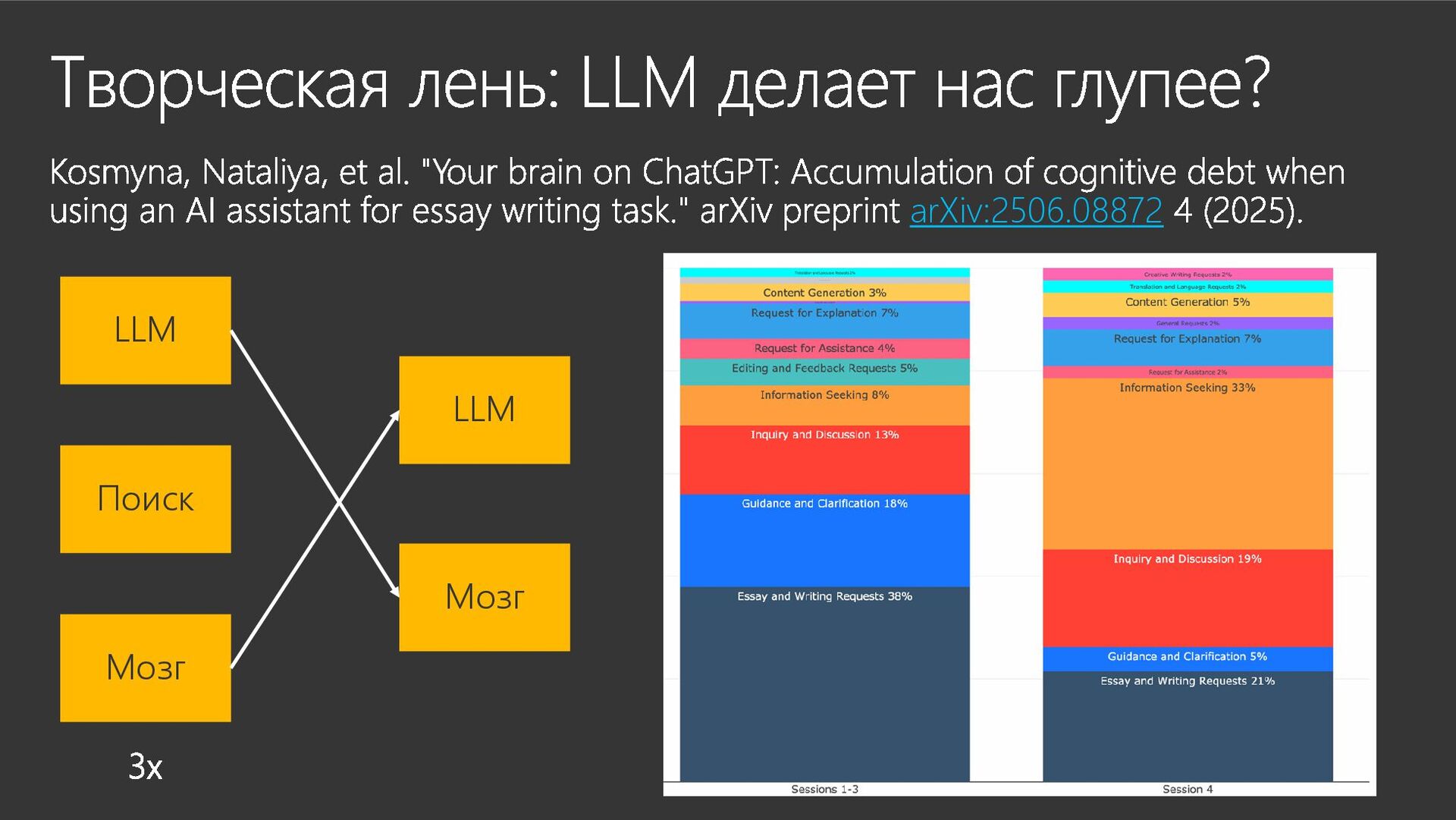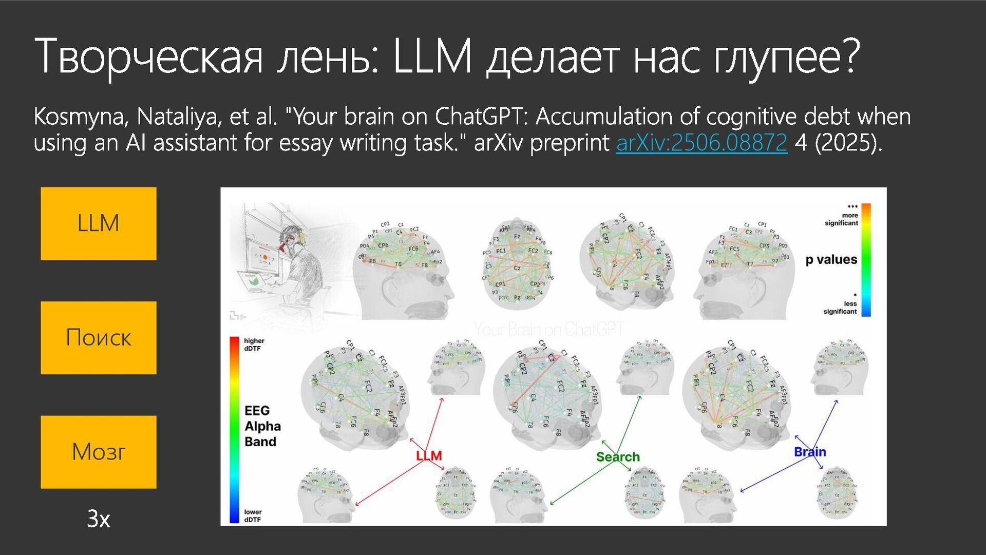 "Your brain on ChatGPT: Accumulation of cognitive debt when using an AI assistant for essay writing task." arXiv preprint arXiv:2506.08872 4 (2025). LLM Поиск Мозг 3x LLM Мозг