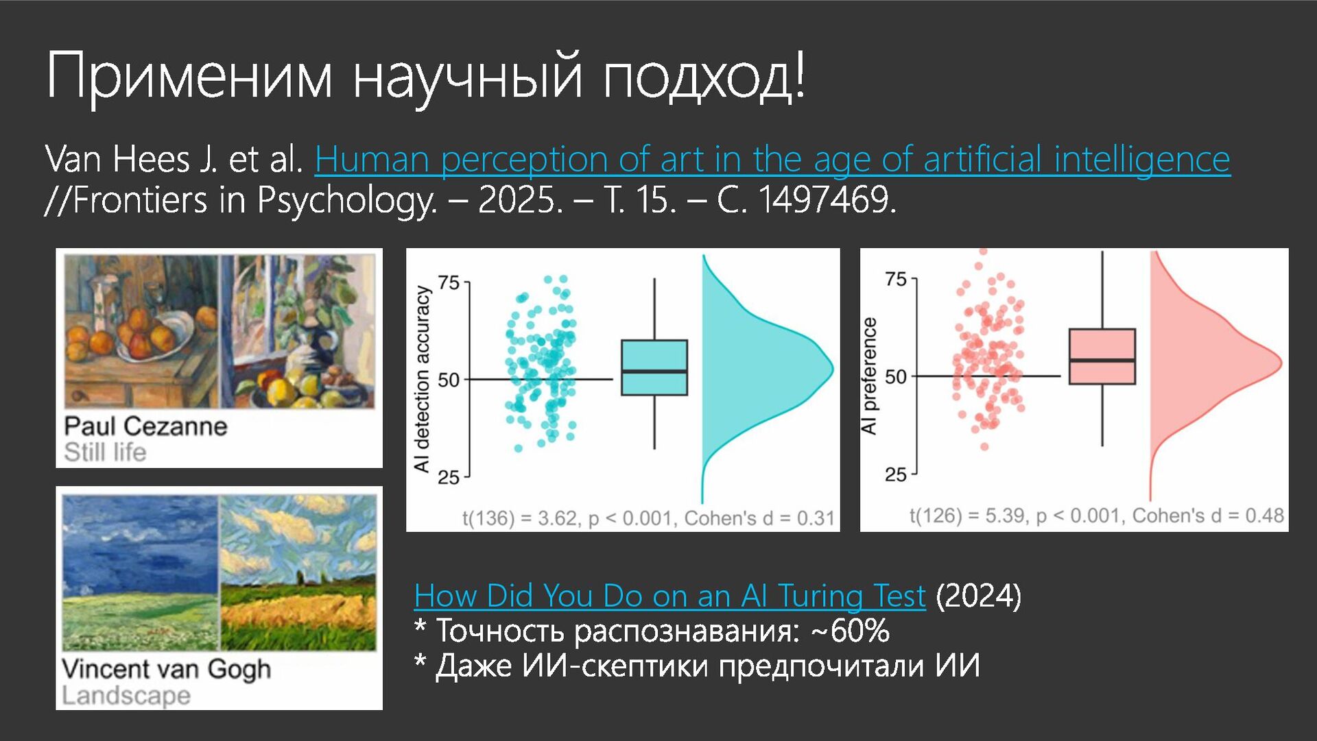 of art in the age of artificial intelligence //Frontiers in Psychology. – 2025. – Т. 15. – С. 1497469. How Did You Do on an AI Turing Test (2024) * Точность распознавания: ~60% * Даже ИИ-скептики предпочитали ИИ
