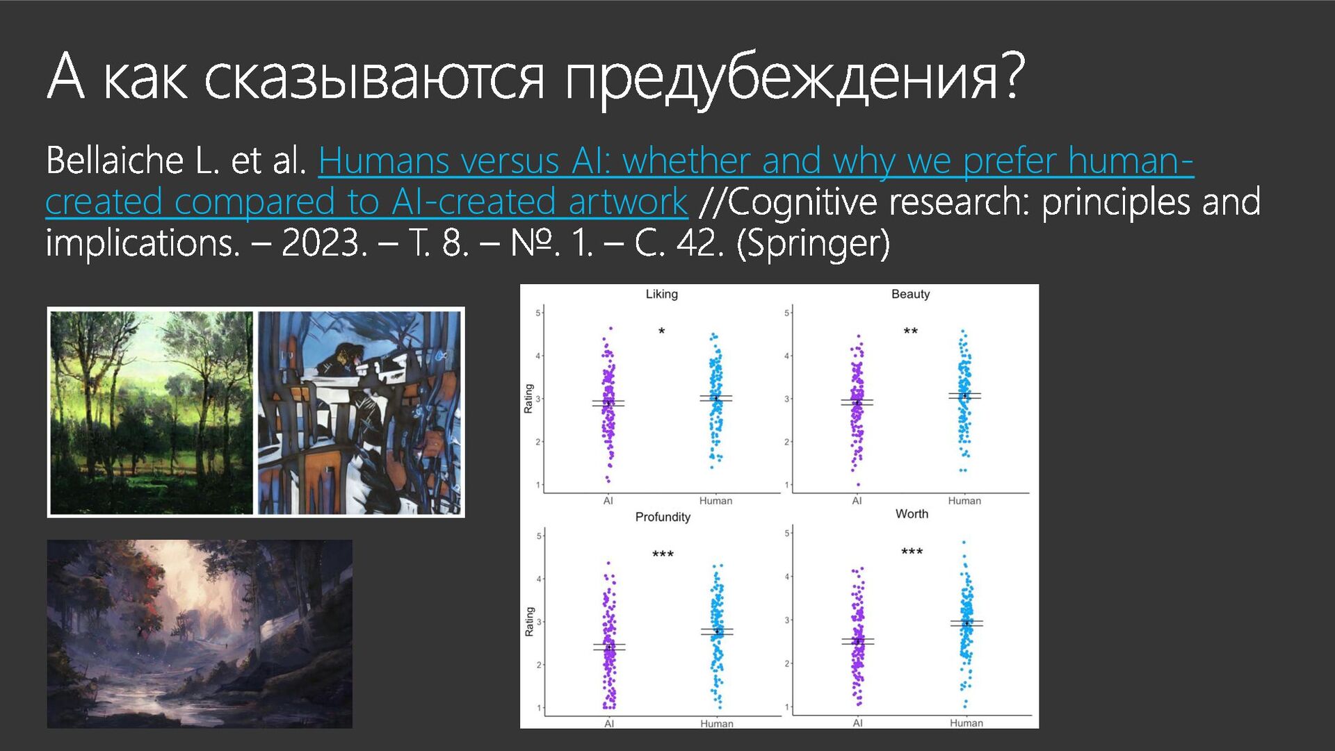 AI: whether and why we prefer human- created compared to AI-created artwork //Cognitive research: principles and implications. – 2023. – Т. 8. – №. 1. – С. 42. (Springer)