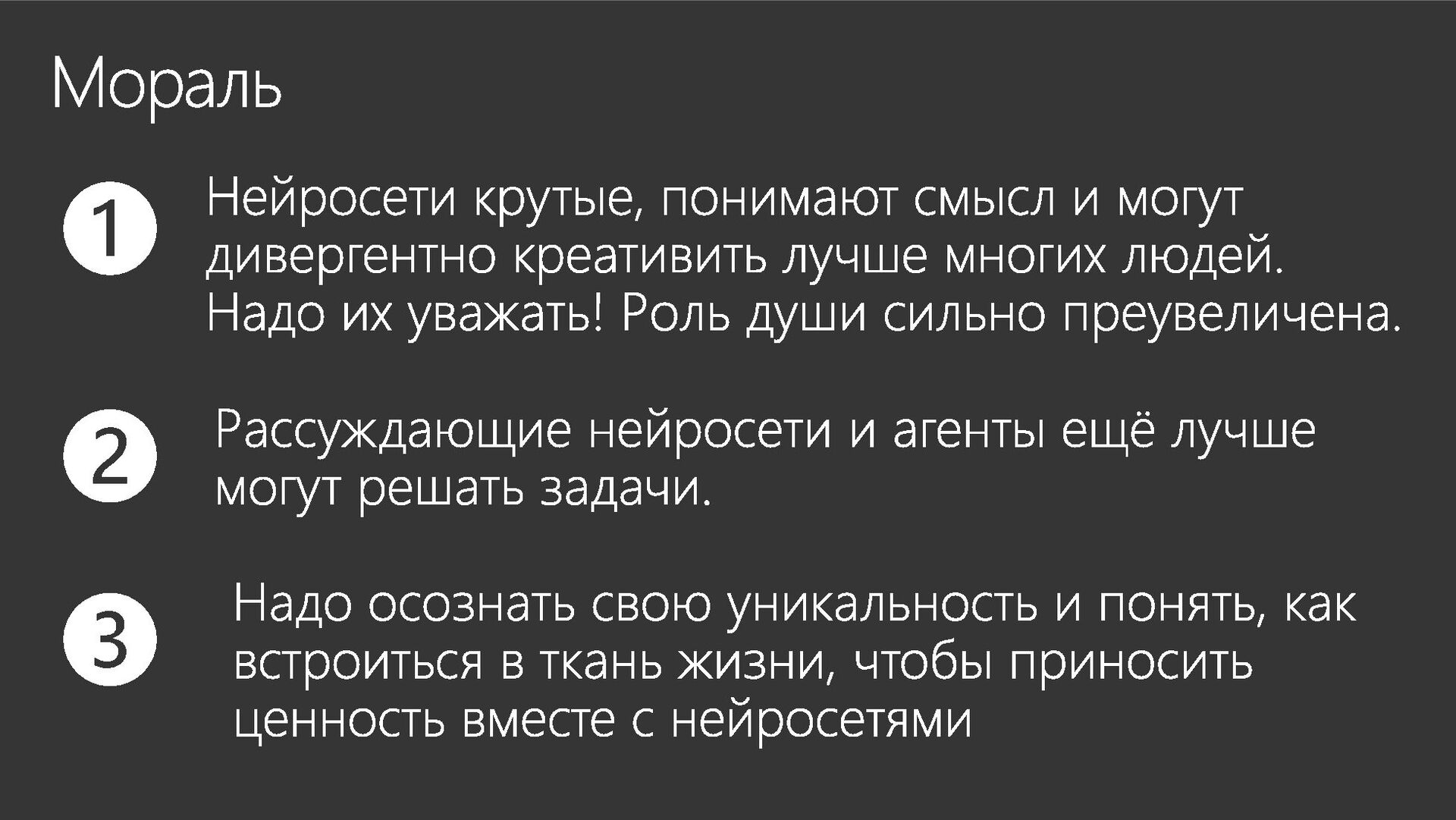 многих людей. Надо их уважать! Роль души сильно преувеличена. Рассуждающие нейросети и агенты ещё лучше могут решать задачи. Надо осознать свою уникальность и понять, как встроиться в ткань жизни, чтобы приносить ценность вместе с нейросетями ❶ ❷ ❸