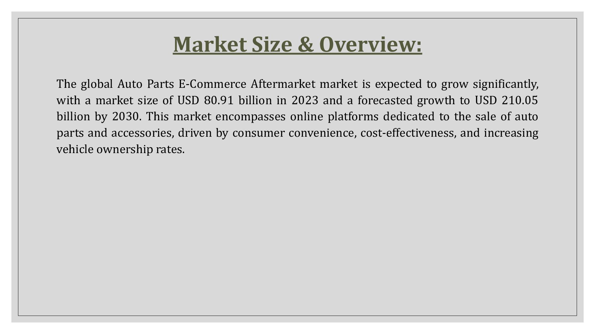 market is expected to grow significantly, with a market size of USD 80.91 billion in 2023 and a forecasted growth to USD 210.05 billion by 2030. This market encompasses online platforms dedicated to the sale of auto parts and accessories, driven by consumer convenience, cost-effectiveness, and increasing vehicle ownership rates.