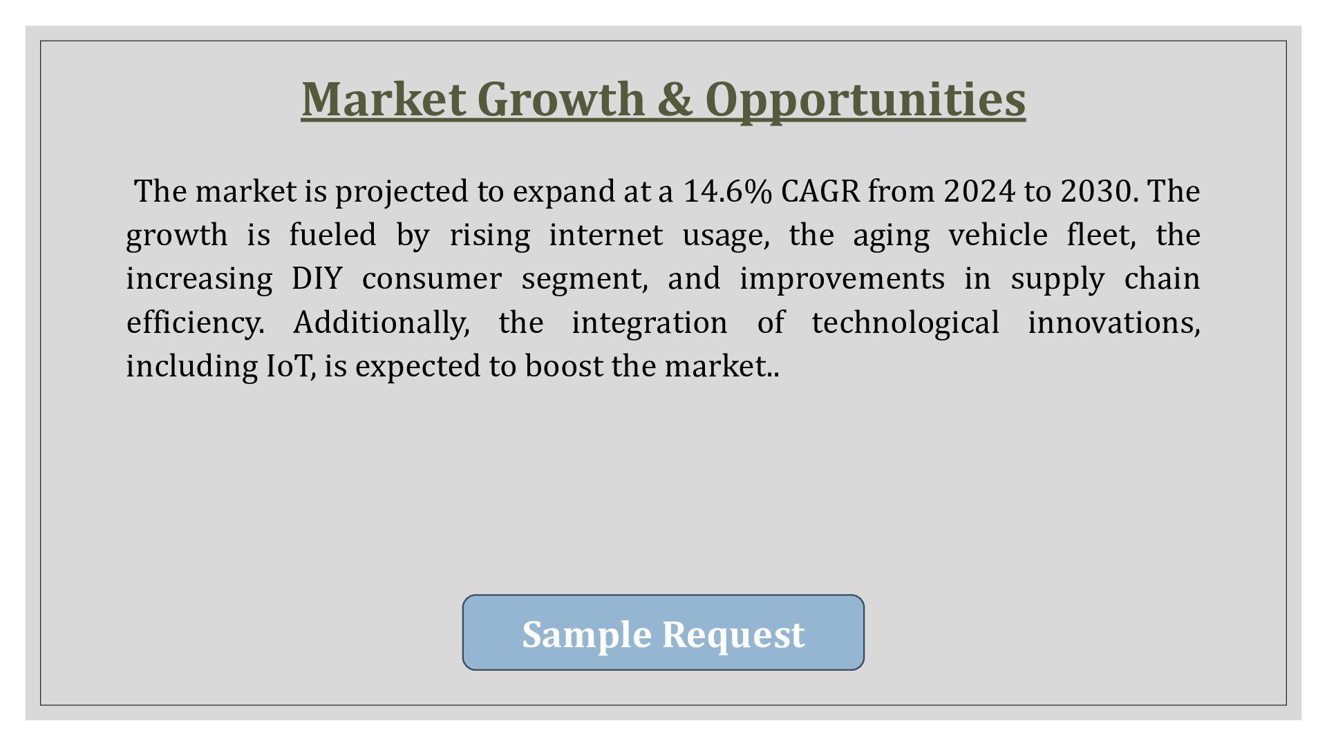 at a 14.6% CAGR from 2024 to 2030. The growth is fueled by rising internet usage, the aging vehicle fleet, the increasing DIY consumer segment, and improvements in supply chain efficiency. Additionally, the integration of technological innovations, including IoT, is expected to boost the market.. Sample Request Sample Request