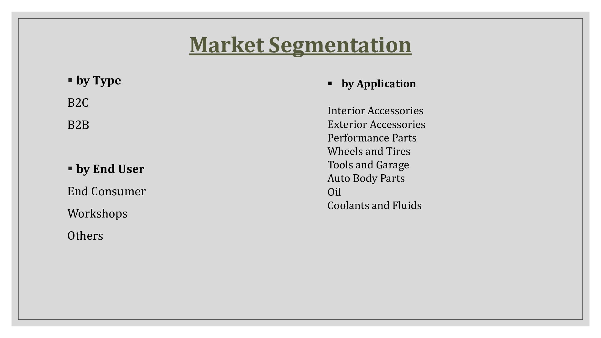 User End Consumer Workshops Others ▪ by Application Interior Accessories Exterior Accessories Performance Parts Wheels and Tires Tools and Garage Auto Body Parts Oil Coolants and Fluids