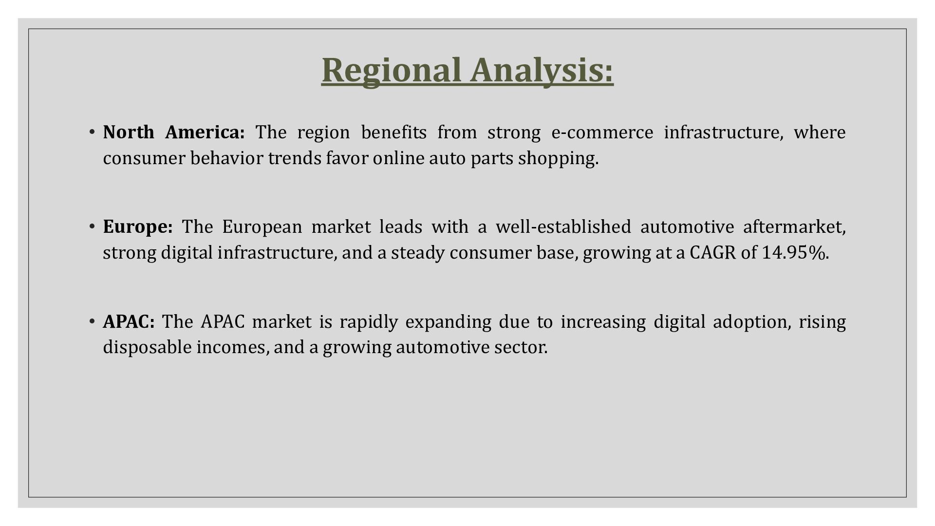 e-commerce infrastructure, where consumer behavior trends favor online auto parts shopping. • Europe: The European market leads with a well-established automotive aftermarket, strong digital infrastructure, and a steady consumer base, growing at a CAGR of 14.95%. • APAC: The APAC market is rapidly expanding due to increasing digital adoption, rising disposable incomes, and a growing automotive sector.