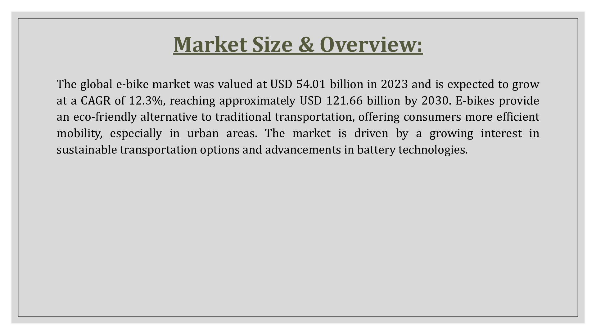 The E-bike Market size was valued at USD 54.01 Bn in 2023 and the total E-bike revenue is expected to grow at a CAGR of 12.3 % from 2024 to 2030, reaching nearly USD 121.66 Bn by 2030.