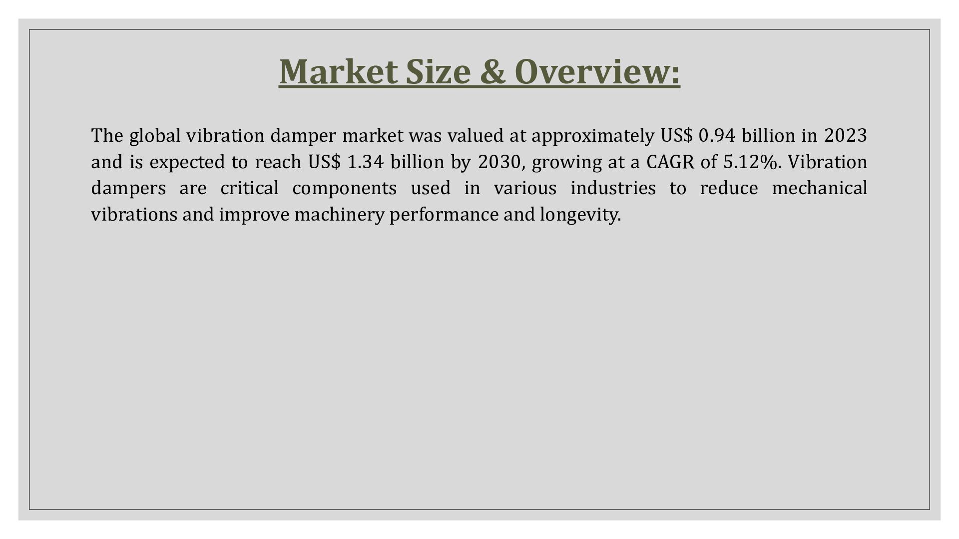 valued at approximately US$ 0.94 billion in 2023 and is expected to reach US$ 1.34 billion by 2030, growing at a CAGR of 5.12%. Vibration dampers are critical components used in various industries to reduce mechanical vibrations and improve machinery performance and longevity.