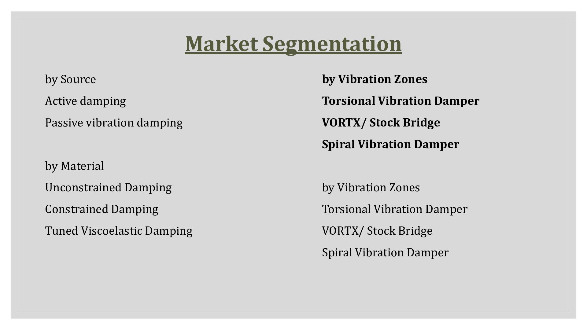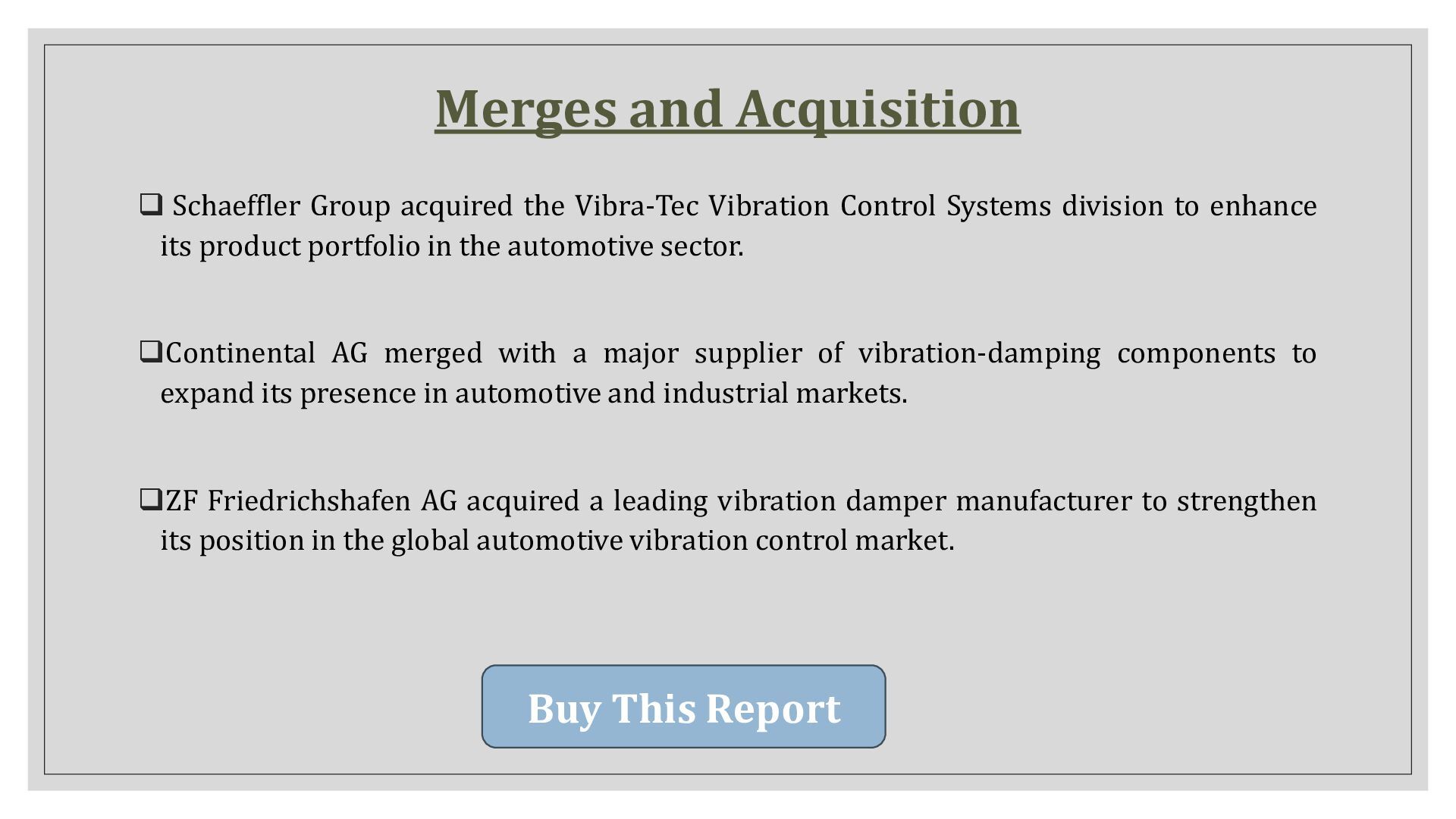 Control Systems division to enhance its product portfolio in the automotive sector. ❑Continental AG merged with a major supplier of vibration-damping components to expand its presence in automotive and industrial markets. ❑ZF Friedrichshafen AG acquired a leading vibration damper manufacturer to strengthen its position in the global automotive vibration control market. Buy This Report Buy This Report