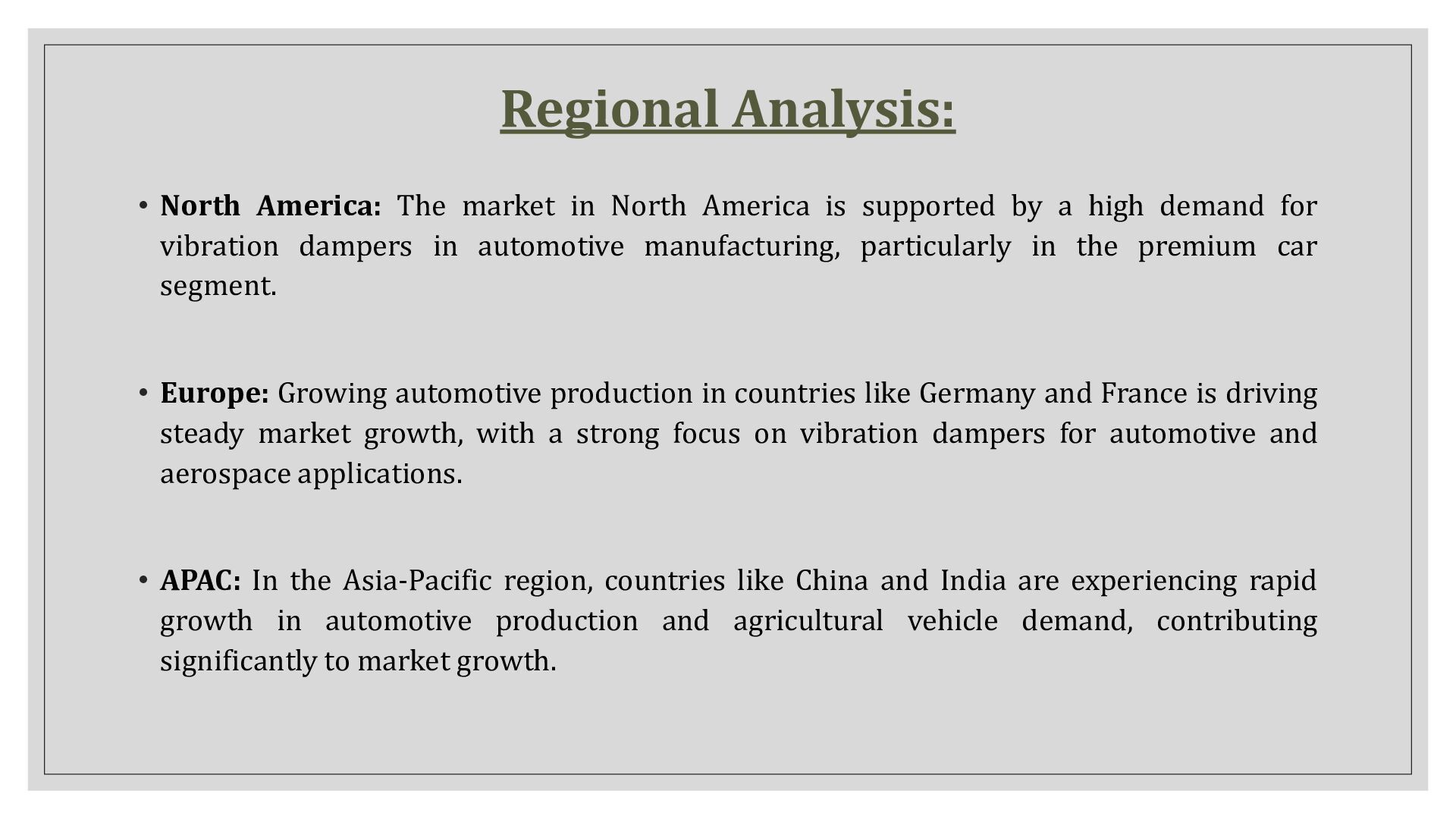 increasing demand from industries like automotive, manufacturing, aviation, and defense. Additionally, expanding urbanization, rising disposable income, and demand for agricultural equipment are contributing to market expansion. The demand for vibration dampers in premium and sports vehicles is another key growth factor. Sample Request Sample Request