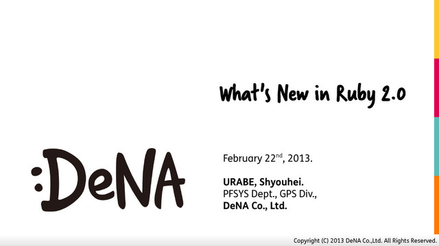 new in Ruby 2 • Almost everything. • “100% backward compatible”, said matz. • (for instance) Rails runs as-is. • Don't be afraid! Just start using 2.0.0!