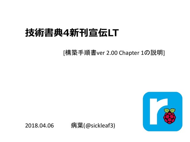 4/22(日)の技術書典4で出す「radiberry pi! 構築手順書ver 2.00」の宣伝スライド 詳細・サークルチェックは以下URLまで。 https://techbookfest.org/event/tbf04/circle/13920001