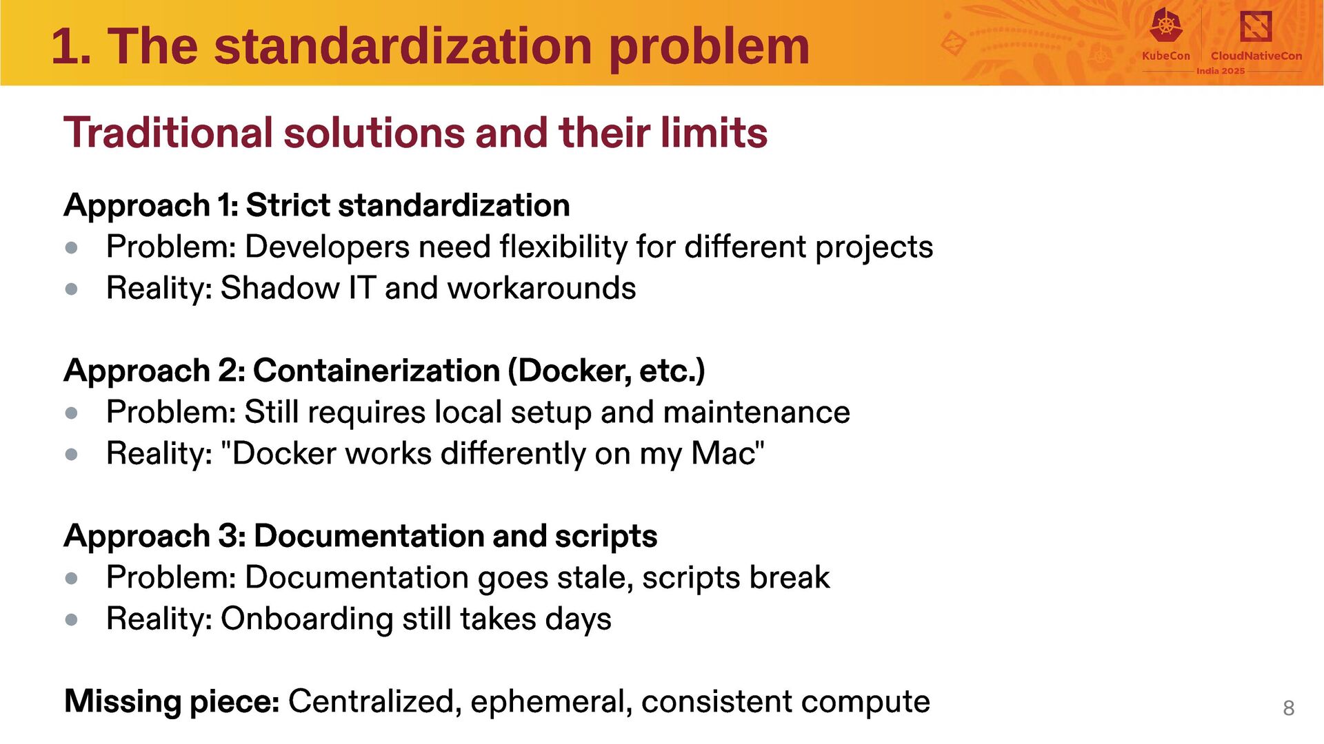 Local dev setups worked fine when teams were small. But when you’re dealing with hundreds or thousands of developers, things start to break - slow onboarding, dependency hell, inconsistent environments, and wasted compute cycles.