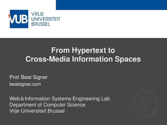 October 25, 2023 References ▪ B. Signer, Fundamental Concepts for Interactive Paper and Cross-Media Information Spaces, Second Edition, ISBN 978-3-8370-2713-6, August 2017 ▪ B. Signer, Towards Cross-Media Information Spaces and Architectures, Proceedings of RCIS 2019, 13th International Conference on Research Challenges in Information Science, Brussels, Belgium, May 2019 ▪ https://beatsigner.com/publications/signer_RCIS2019.pdf ▪ Interview with Beat Signer, Claus Atzenbeck, ACM SIGWEB Newsletter 2021(Winter), February 2021 ▪ https://beatsigner.com/publications/interview-with-beat-signer.pdf