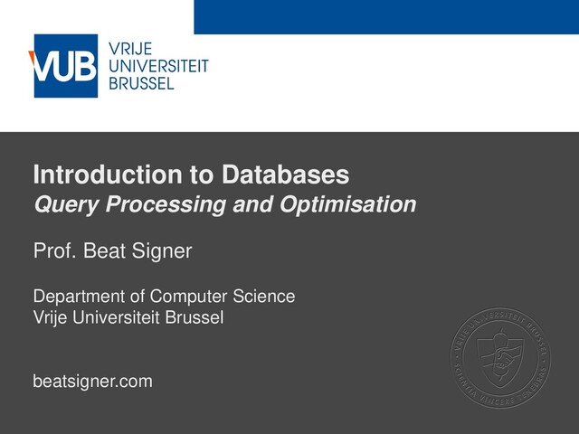 May 8, 2019 Basic Query Processing Steps ... ▪ Query parsing and translation (query compiler) ▪ check the syntax (e.g. SQL for relational DBMS) ▪ verify that the mentioned relations do exist and replace views ▪ transform the SQL query to a query plan represented by a relational algebra expression (for relational DBMS) - different possible relational algebra expressions for a single query ▪ Query optimisation (query optimiser) ▪ transform the initial query plan into the best possible query plan based on the given data set - specify the execution of single query plan operations (evaluation primitives) • e.g. which algorithms and indices to be used - the query execution plan is defined by a sequence of evaluation primitives ▪ Query evaluation (command processor) ▪ execute the query execution plan and return the result