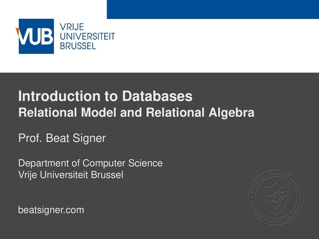 February 27, 2019 Relational Database ▪ A relational database consists of a number of tables ▪ each table row defines a relationship between a set of values ▪ There is an analogy between the concept of a table (collection of relationships) and the mathematical concept of a relation ▪ in the following we therefore talk about relations instead of tables ▪ → a relational database consists of a collection of relations customerID name street postcode city 1 Max Frisch Bahnhofstrasse 7 8001 Zurich 2 Eddy Merckx Pleinlaan 25 1050 Brussels ... ... ... ... ...