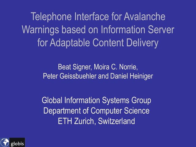 ABSTRACT: We present a system that provides an advanced telephone service for the dissemination of both national and regional avalanche forecasts in the Swiss Alps. The service enables members of the public and also mountain guides to access forecast information while travelling in mountain areas and, particularly, to be notified when entering regions of high risk. By telephone access, we include both voice and WAP-based access as well as combinations of both. The service is achieved through the integration of a special forecast content delivery database, including geographical data for location-dependent delivery, into the overall avalanche information system architecture. This database was implemented using the XIMA framework for adaptable content delivery, which is based on an XML server for the OMS Java data management system and XSLT presentation templates. The speech interface was implemented using VoiceXML.