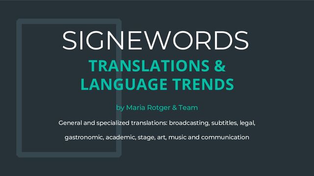 General and specialized translations: broadcasting, subtitles, legal, gastronomic, academic, stage, art, music and communication.