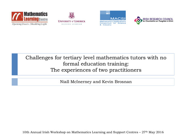 tutors with no formal education training: The experiences of two practitioners 10th Annual Irish Workshop on Mathematics Learning and Support Centres – 27th May 2016
