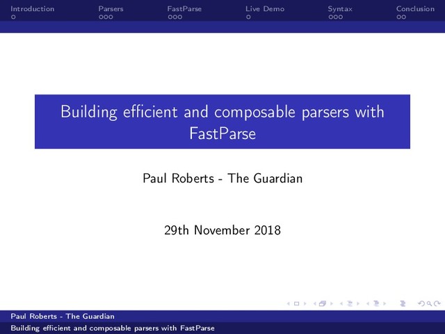 Parsers are a fundamental part of all kinds of software, and Paul will guide us through creating them the Scala-way with FastParse's parser combinators. We'll look at how FastParse provides a nice API without sacrificing performance, and he will illustrate the method for building a parser and benchmarking its performance in a live demo.