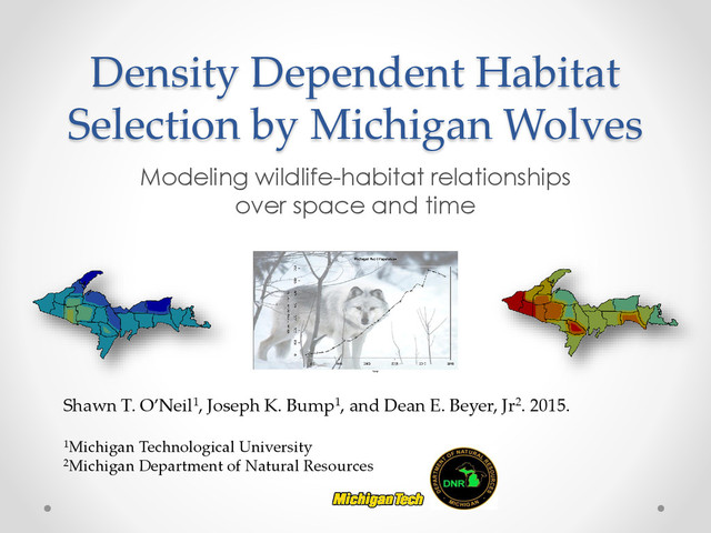 Brian Roell, Chris Webster, Michigan Department of Natural Resources • List of references: • Aarts, G., J. Fieberg, S. Brasseur, and J. Matthiopoulos. 2013. Quantifying the effect of habitat availability on species distributions. Journal of Animal Ecology 82:1135-1145. • Franklin, A. B., D. R. Anderson, R. J. Gutiérrez, and K. P. Burnham. 2000. Climate, habitat quality, and fitness in Northern Spotted Owl populations in northwestern California. Ecological Monographs 70:539-590. • Hebblewhite, M., and E. Merrill. 2008. Modelling wildlife-human relationships for social species with mixed-effects resource selection models. Journal of Applied Ecology 45:834-844. • Houle, M., D. Fortin, C. Dussault, R. Courtois, and J. P. Ouellet. 2010. Cumulative effects of forestry on habitat use by gray wolf (Canis lupus) in the boreal forest. Landscape Ecology 25:419-433. • Lesmerises, F., C. Dussault, and M. H. St-Laurent. 2012. Wolf habitat selection is shaped by human activities in a highly managed boreal forest. Forest Ecology and Management 276:125-131. • Matthiopoulos, J., M. Hebblewhite, G. Aarts, and J. Fieberg. 2011. Generalized functional responses for species distributions. Ecology 92:583-589. • McDonald, L., B. Manly, F. Huettmann, and W. Thogmartin. 2013. Location-only and use-availability data: analysis methods converge. Journal of Animal Ecology 82:1120-1124. • McLoughlin, P. D., D. W. Morris, D. Fortin, E. Vander Wal, and A. L. Contasti. 2010. Considering ecological dynamics in resource selection functions. Journal of Animal Ecology 79:4-12. • Mills, L. S. 2012. Conservation of wildlife populations: demography, genetics, and management. John Wiley & Sons. • Mladenoff, D. J., T. A. Sickley, R. G. Haight, and A. P. Wydeven. 1995. A regional landscape analysis and prediction of favorable gray wolf habitat in the Northern Great Lakes Region. Conservation Biology 9:279-294. • Mosser, A., J. M. Fryxell, L. Eberly, and C. Packer. 2009. Serengeti real estate: density vs. fitness-based indicators of lion habitat quality. Ecology Letters 12:1050-1060. • Potvin, M. J., T. D. Drummer, J. A. Vucetich, D. E. Beyer, R. O. Peterson, and J. H. Hammill. 2005. Monitoring and habitat analysis for wolves in upper Michigan. Journal of Wildlife Management 69:1660-1669. • Uboni, A., D. W. Smith, J. S. Mao, D. R. Stahler, and J. A. Vucetich. 2015a. Long- and short-term temporal variability in habitat selection of a top predator. Ecosphere 6:art51. • Uboni, A., J. A. Vucetich, D. R. Stahler, and D. W. Smith. 2015b. Interannual variability: a crucial component of space use at the territory level. Ecology 96:62-70.