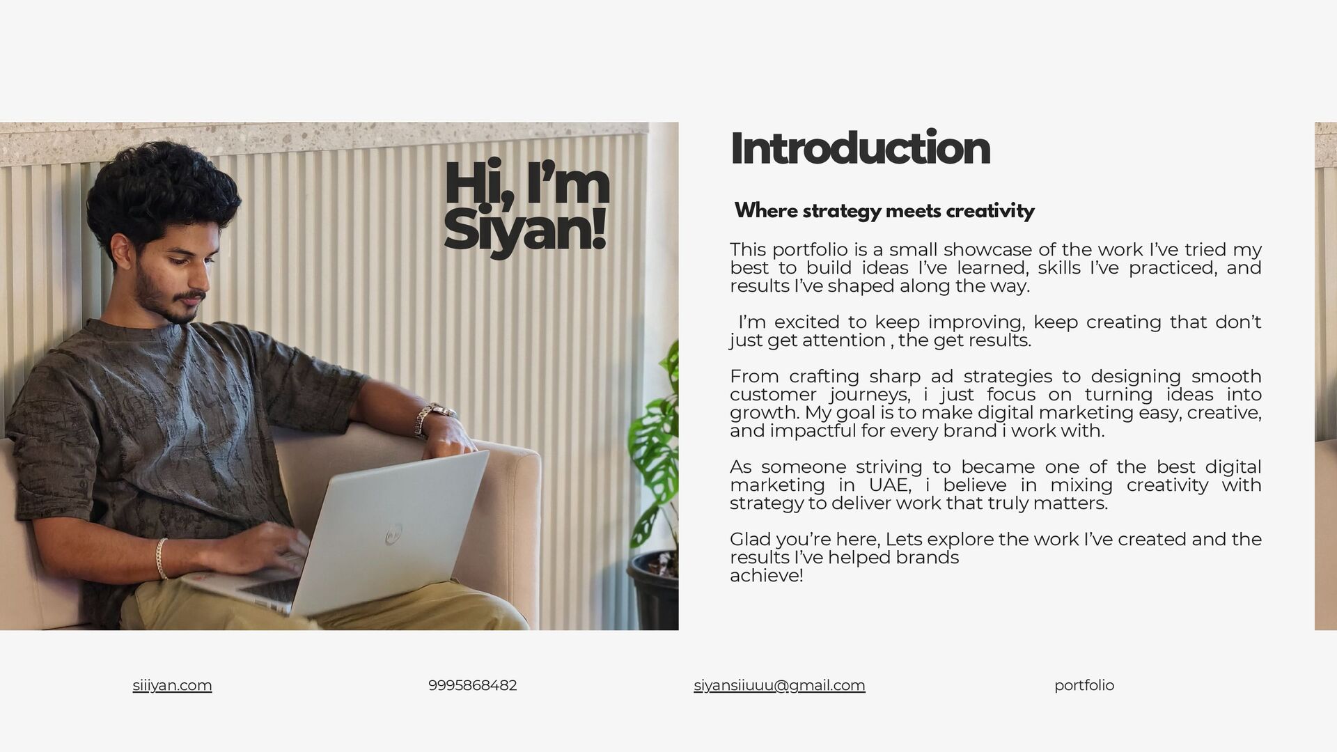 showcase of the work I’ve tried my best to build ideas I’ve learned, skills I’ve practiced, and results I’ve shaped along the way. I’m excited to keep improving, keep creating that don’t just get attention , the get results. From crafting sharp ad strategies to designing smooth customer journeys, i just focus on turning ideas into growth. My goal is to make digital marketing easy, creative, and impactful for every brand i work with. As someone striving to became one of the best digital marketing in UAE, i believe in mixing creativity with strategy to deliver work that truly matters. Glad you’re here, Lets explore the work I’ve created and the results I’ve helped brands achieve! Hi, I’m Siyan! 9995868482 [email protected] siiiyan.com portfolio