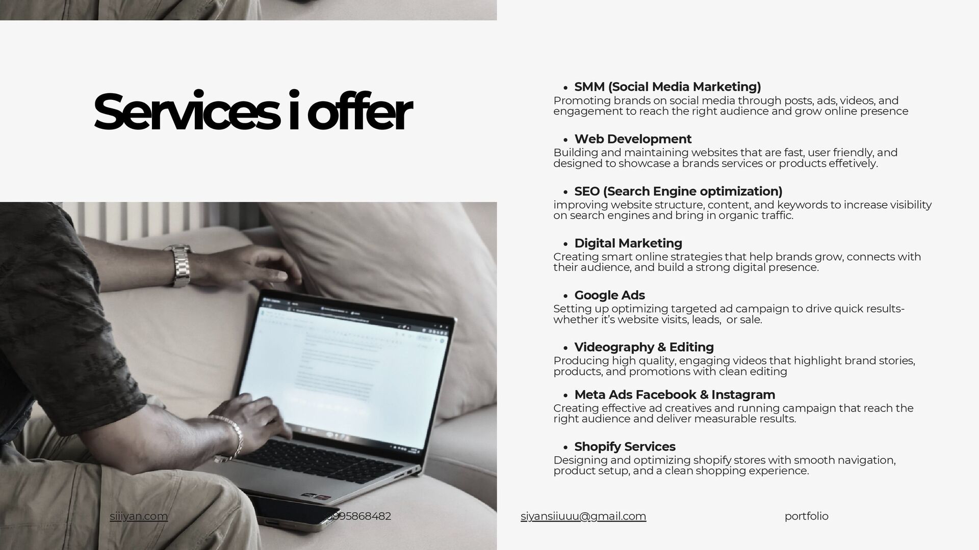 ads, videos, and engagement to reach the right audience and grow online presence SMM (Social Media Marketing) Building and maintaining websites that are fast, user friendly, and designed to showcase a brands services or products effetively. Web Development improving website structure, content, and keywords to increase visibility on search engines and bring in organic traffic. SEO (Search Engine optimization) Digital Marketing Creating smart online strategies that help brands grow, connects with their audience, and build a strong digital presence. Google Ads Setting up optimizing targeted ad campaign to drive quick results- whether it’s website visits, leads, or sale. Videography & Editing Producing high quality, engaging videos that highlight brand stories, products, and promotions with clean editing Meta Ads Facebook & Instagram Creating effective ad creatives and running campaign that reach the right audience and deliver measurable results. Shopify Services Designing and optimizing shopify stores with smooth navigation, product setup, and a clean shopping experience. 9995868482 [email protected] siiiyan.com portfolio