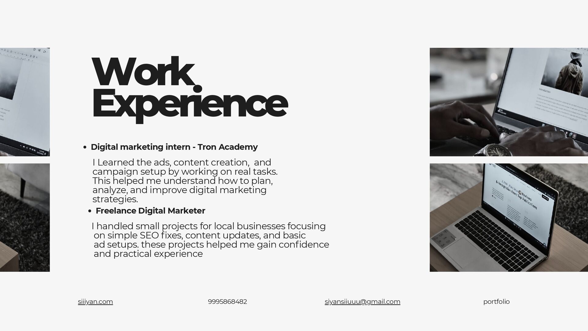 setup by working on real tasks. This helped me understand how to plan, analyze, and improve digital marketing strategies. Digital marketing intern - Tron Academy Freelance Digital Marketer I handled small projects for local businesses focusing on simple SEO fixes, content updates, and basic ad setups. these projects helped me gain confidence and practical experience 9995868482 [email protected] siiiyan.com portfolio