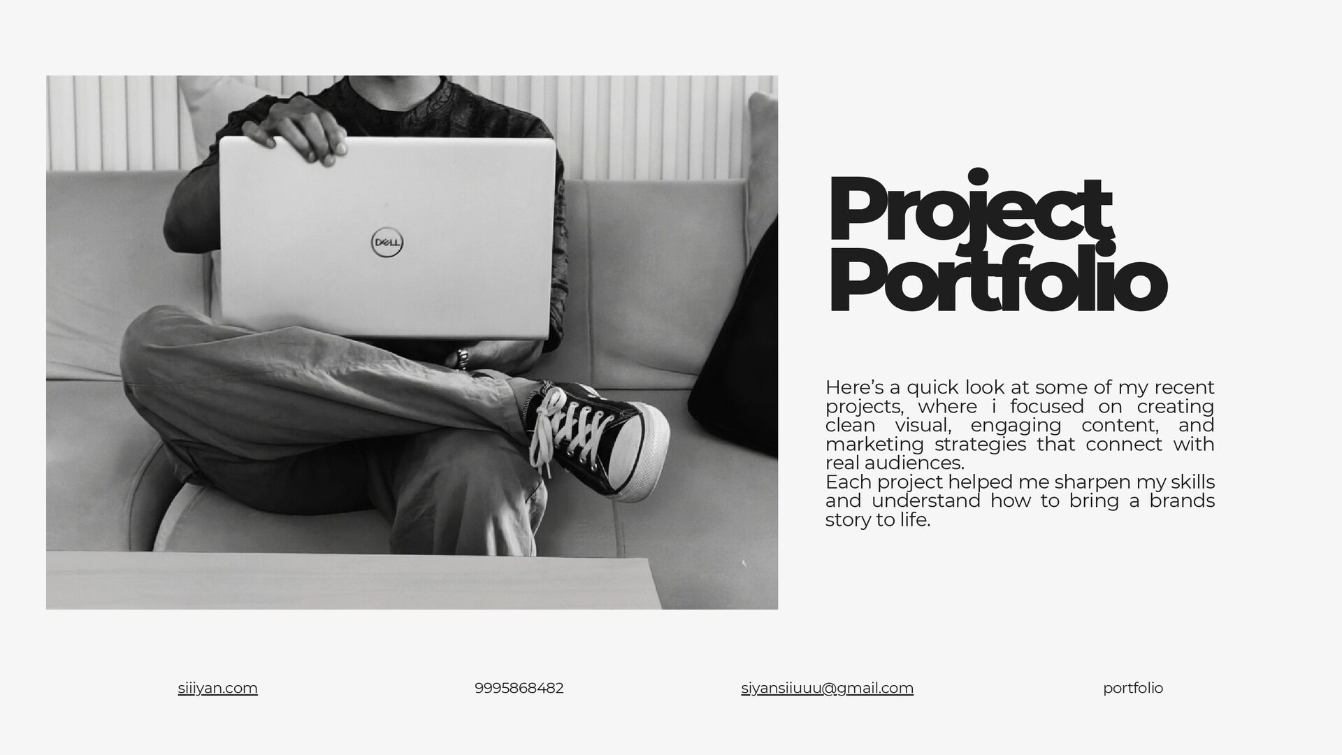 recent projects, where i focused on creating clean visual, engaging content, and marketing strategies that connect with real audiences. Each project helped me sharpen my skills and understand how to bring a brands story to life. 9995868482 [email protected] siiiyan.com portfolio