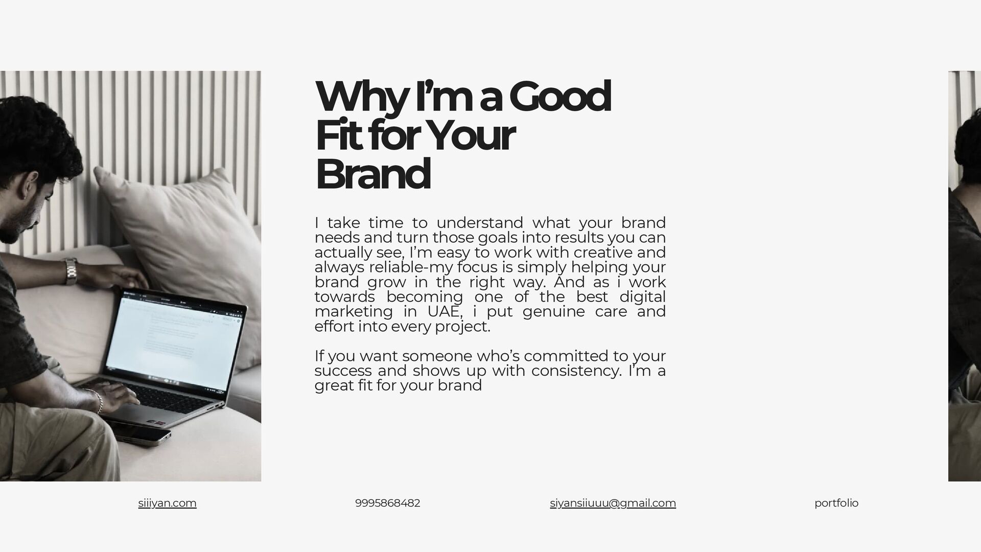 time to understand what your brand needs and turn those goals into results you can actually see, I’m easy to work with creative and always reliable-my focus is simply helping your brand grow in the right way. And as i work towards becoming one of the best digital marketing in UAE, i put genuine care and effort into every project. If you want someone who’s committed to your success and shows up with consistency. I’m a great fit for your brand 9995868482 [email protected] siiiyan.com portfolio