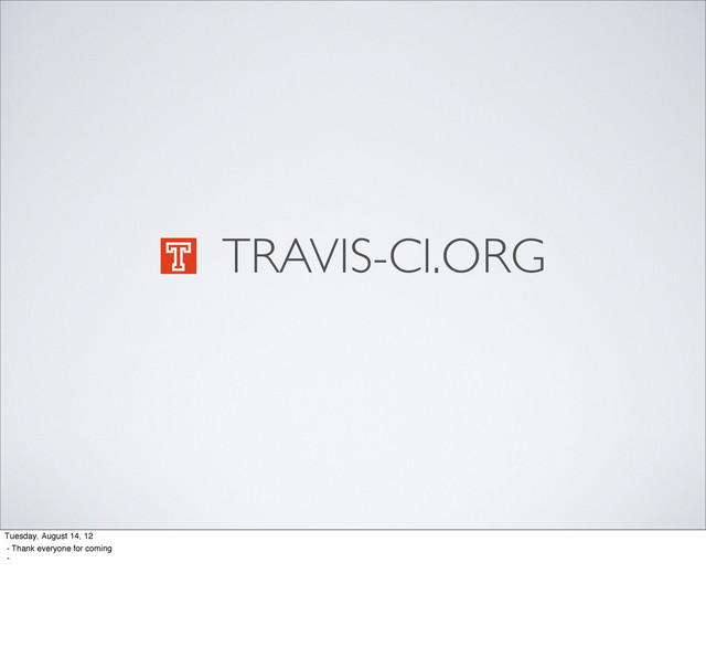 • https://github.com/travis-ci Tuesday, August 14, 12 - CI is just the continuous process of applying tests to your code. Jenkins (Hudson) is another popular CI tool. - Anyone can play around with the source code, help improve it