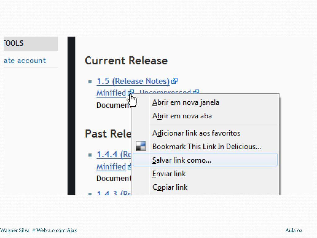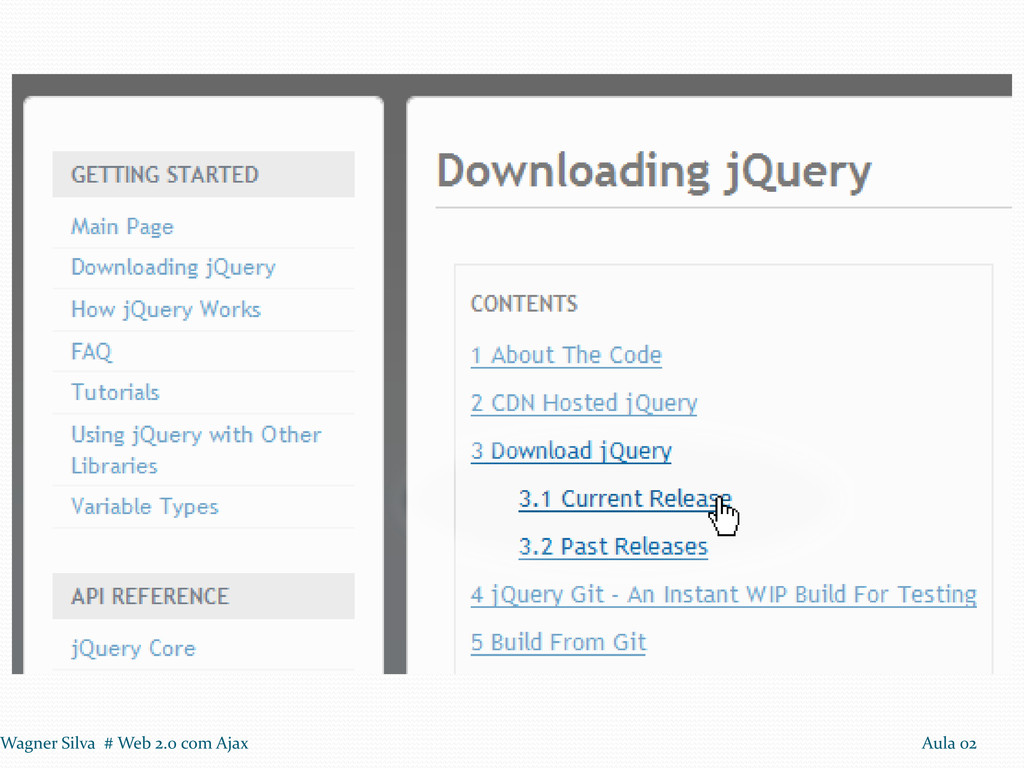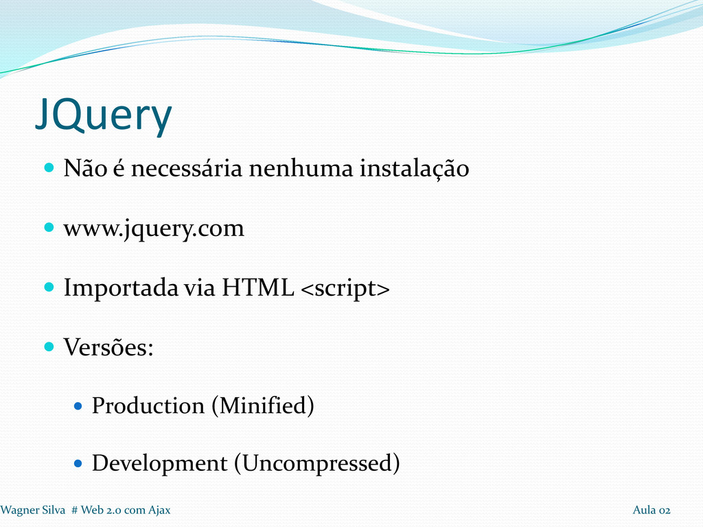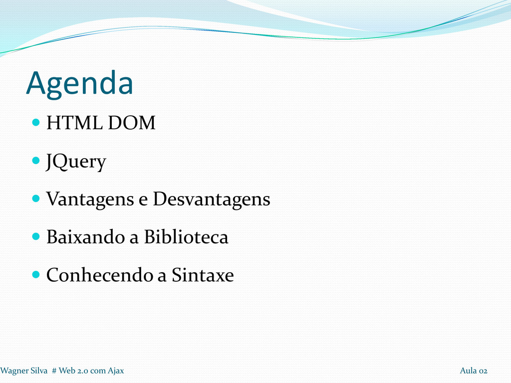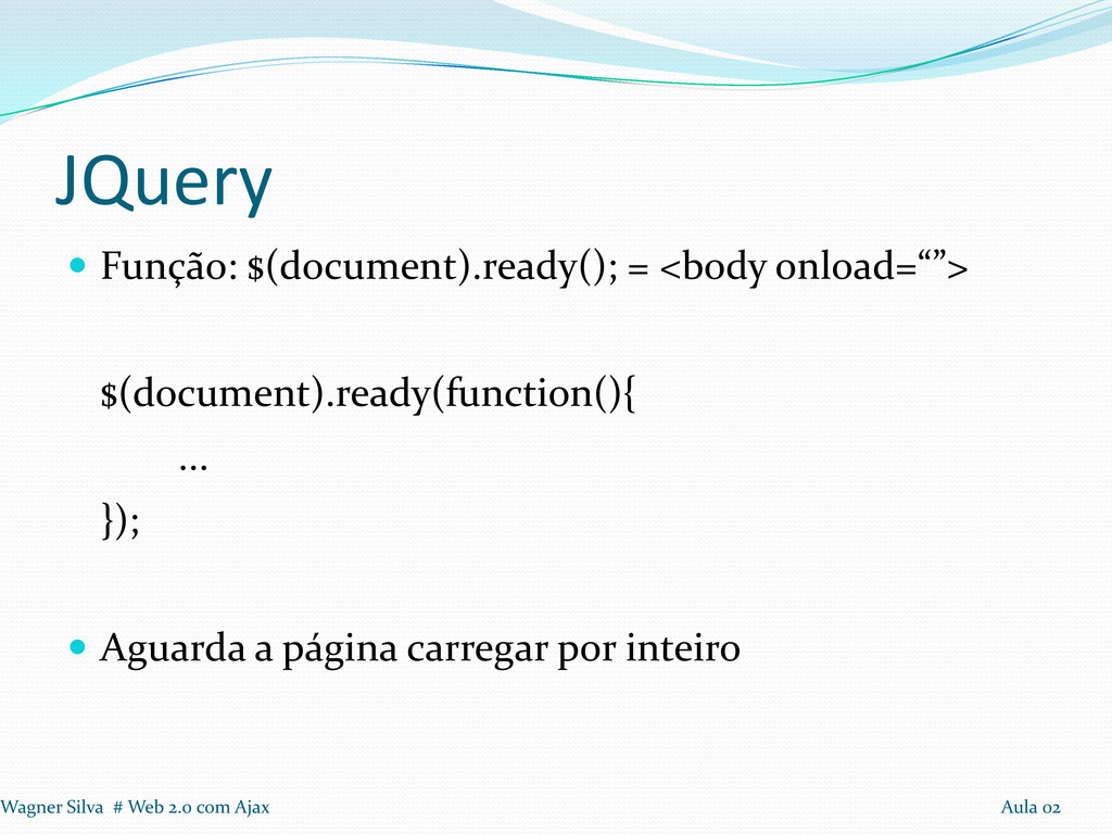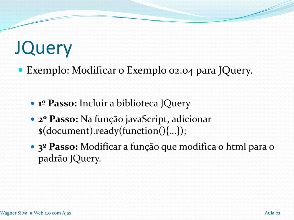 1º Passo: Incluir a biblioteca JQuery 2º Passo: Na função javaScript, adicionar $(document).ready(function(){...}); 3º Passo: Modificar a função que modifica o html para o padrão JQuery. Wagner Silva # Web 2.0 com Ajax Aula 02