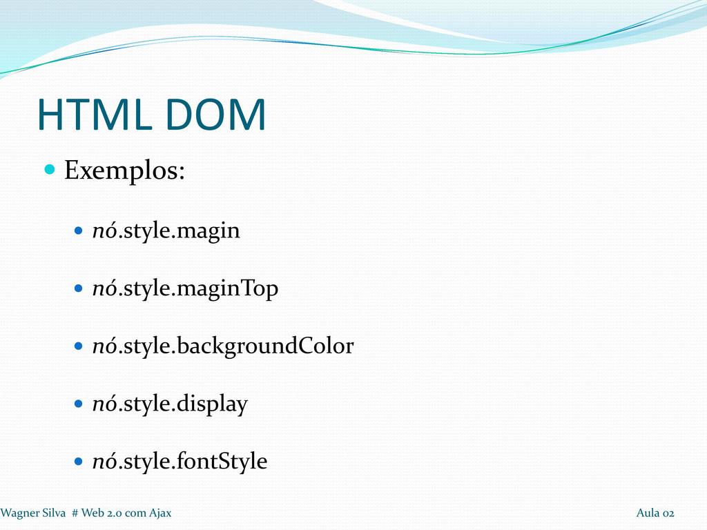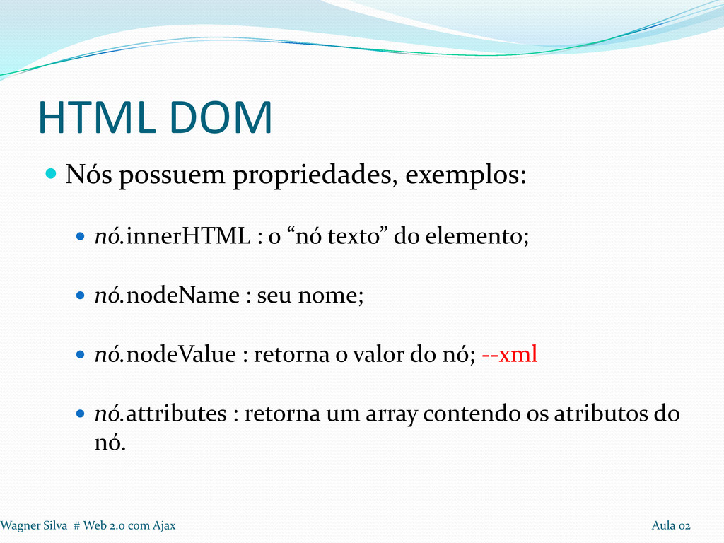 o “nó texto” do elemento; nó.nodeName : seu nome; nó.nodeValue : retorna o valor do nó; --xml nó.attributes : retorna um array contendo os atributos do nó. Wagner Silva # Web 2.0 com Ajax Aula 02