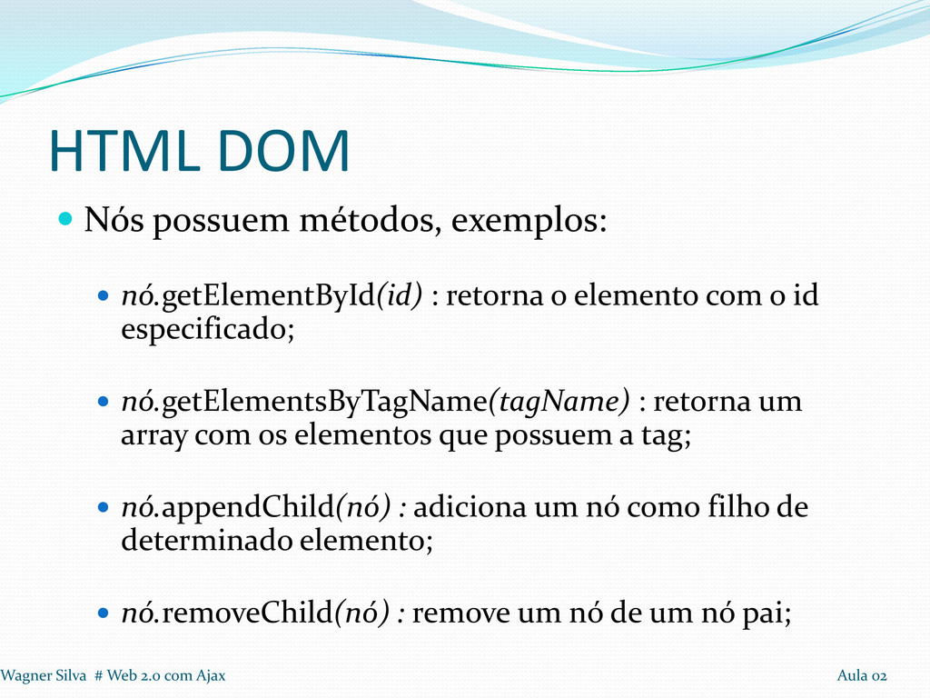 retorna o elemento com o id especificado; nó.getElementsByTagName(tagName) : retorna um array com os elementos que possuem a tag; nó.appendChild(nó) : adiciona um nó como filho de determinado elemento; nó.removeChild(nó) : remove um nó de um nó pai; Wagner Silva # Web 2.0 com Ajax Aula 02