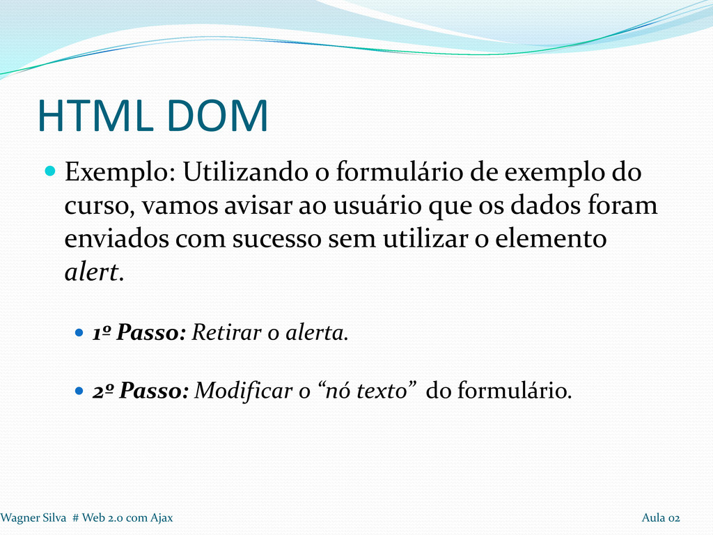 curso, vamos avisar ao usuário que os dados foram enviados com sucesso sem utilizar o elemento alert. 1º Passo: Retirar o alerta. 2º Passo: Modificar o “nó texto” do formulário. Wagner Silva # Web 2.0 com Ajax Aula 02