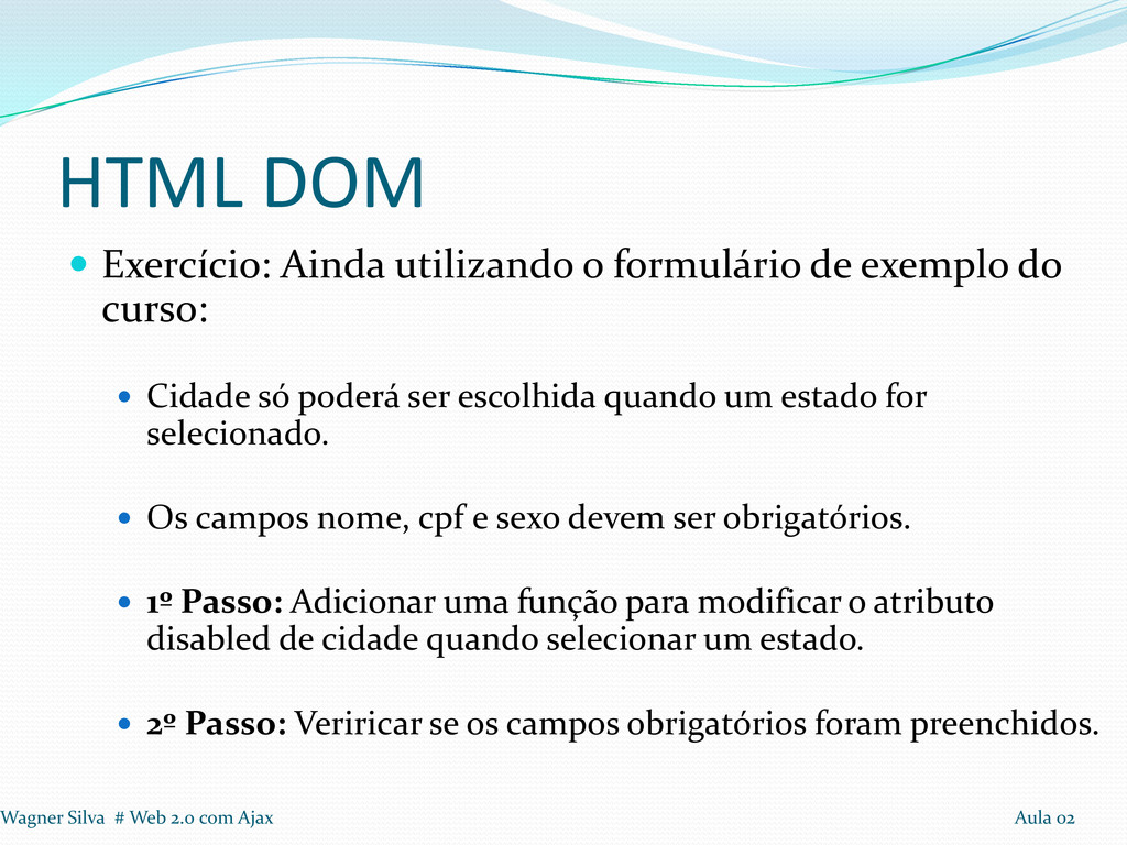 do curso: Cidade só poderá ser escolhida quando um estado for selecionado. Os campos nome, cpf e sexo devem ser obrigatórios. 1º Passo: Adicionar uma função para modificar o atributo disabled de cidade quando selecionar um estado. 2º Passo: Veriricar se os campos obrigatórios foram preenchidos. Wagner Silva # Web 2.0 com Ajax Aula 02