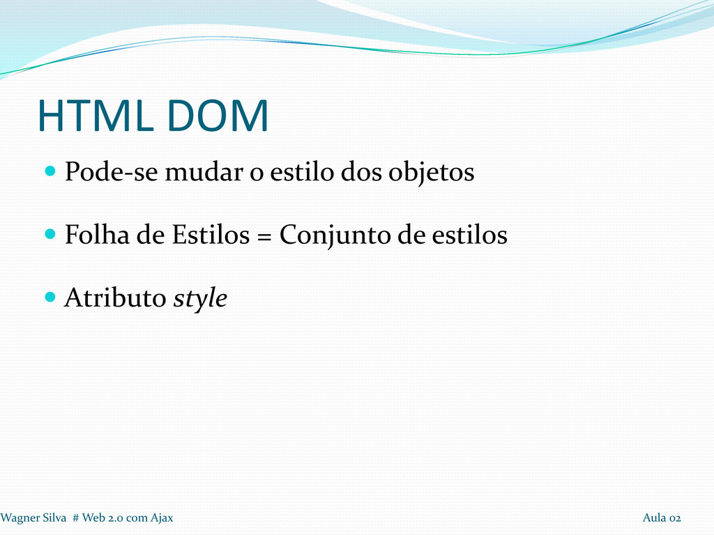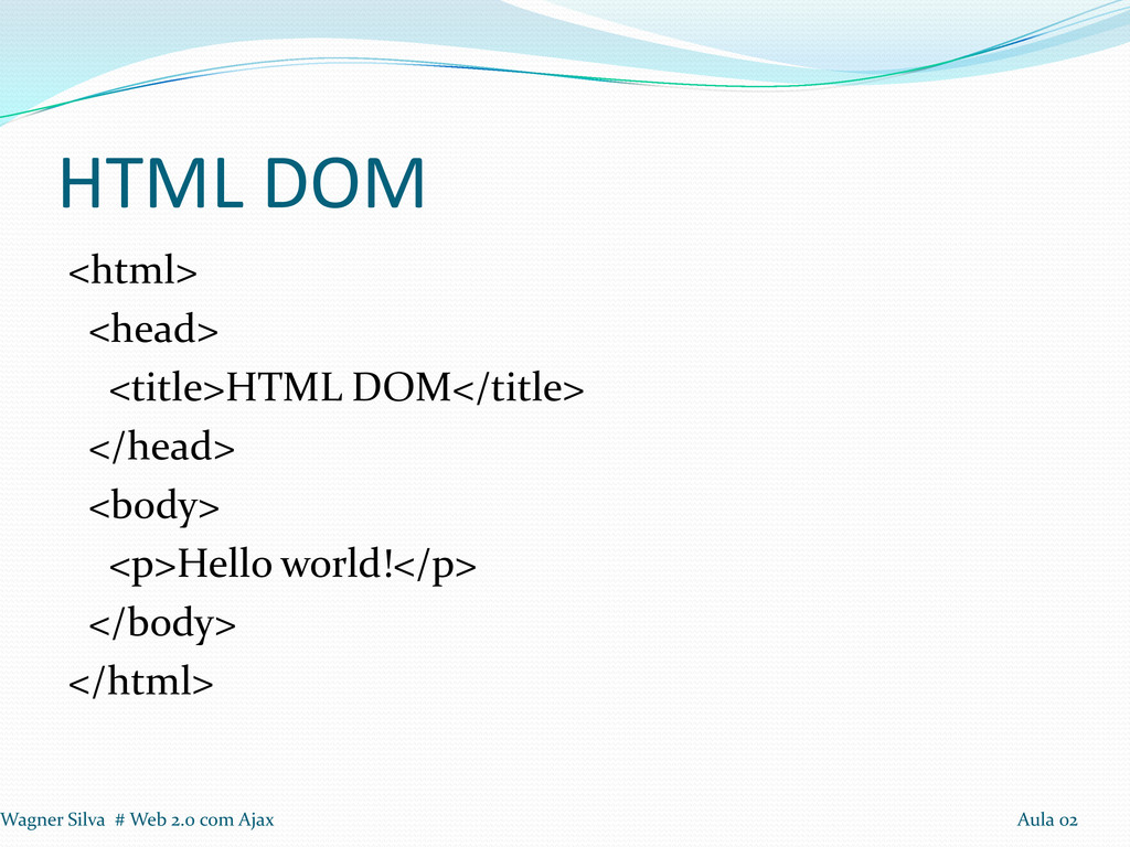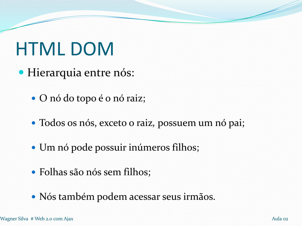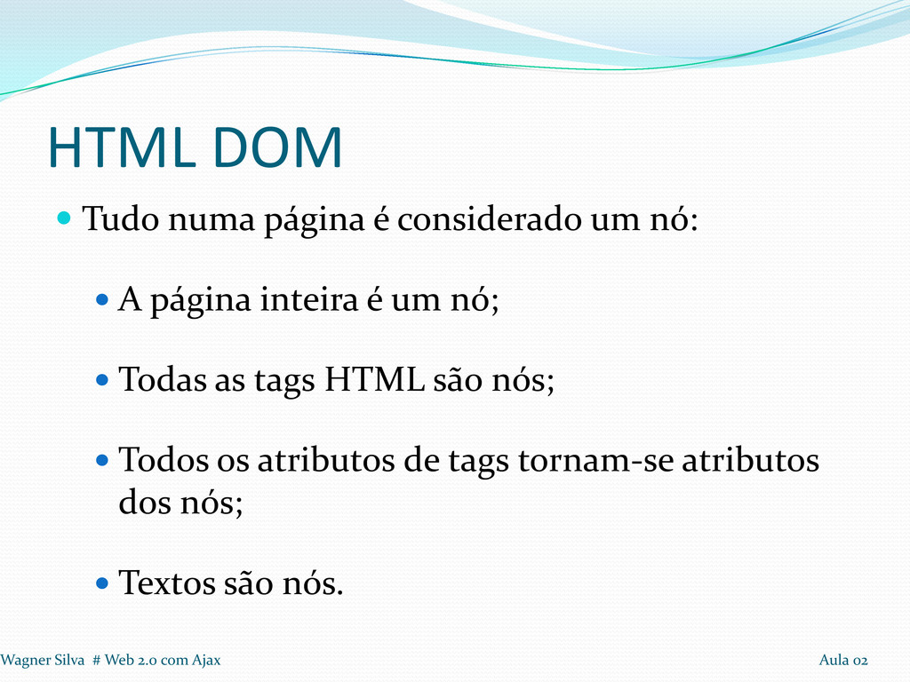 A página inteira é um nó; Todas as tags HTML são nós; Todos os atributos de tags tornam-se atributos dos nós; Textos são nós. Wagner Silva # Web 2.0 com Ajax Aula 02