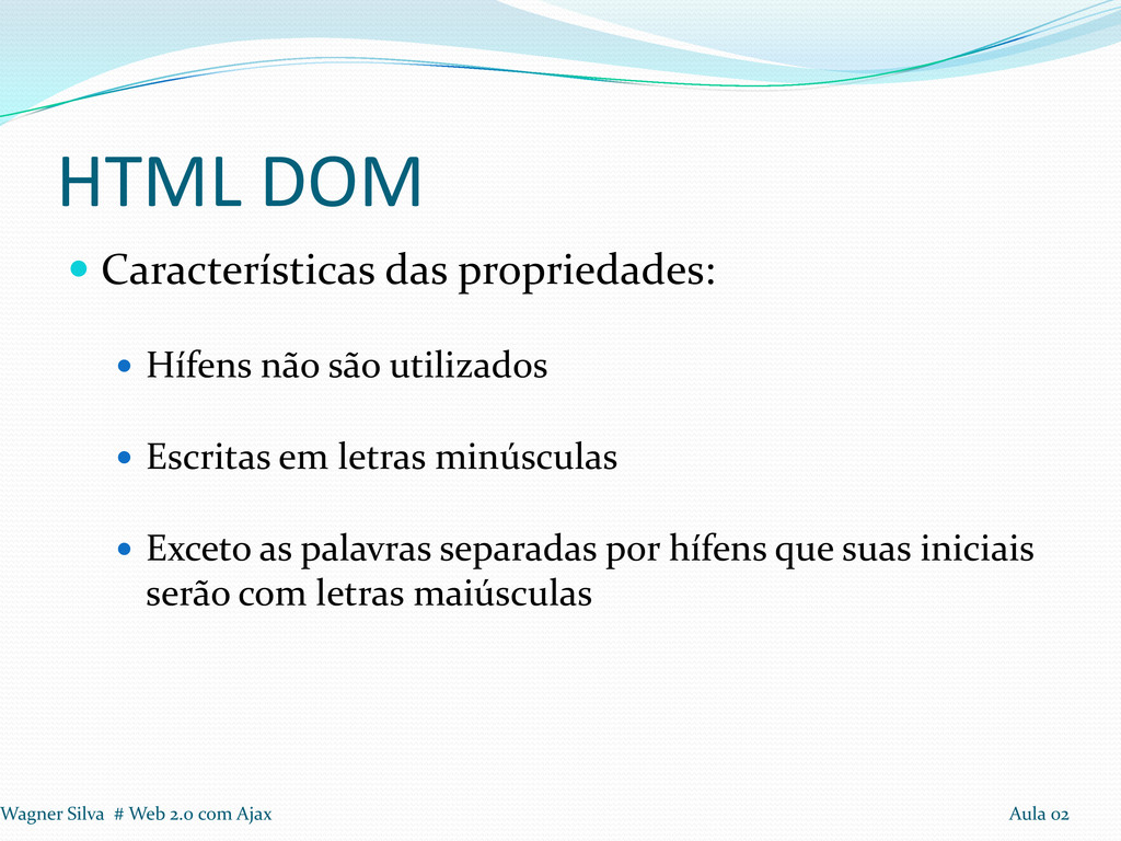 utilizados Escritas em letras minúsculas Exceto as palavras separadas por hífens que suas iniciais serão com letras maiúsculas Wagner Silva # Web 2.0 com Ajax Aula 02