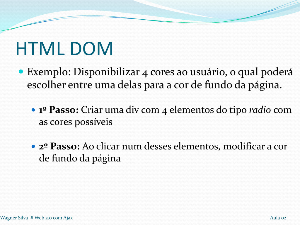 qual poderá escolher entre uma delas para a cor de fundo da página. 1º Passo: Criar uma div com 4 elementos do tipo radio com as cores possíveis 2º Passo: Ao clicar num desses elementos, modificar a cor de fundo da página Wagner Silva # Web 2.0 com Ajax Aula 02