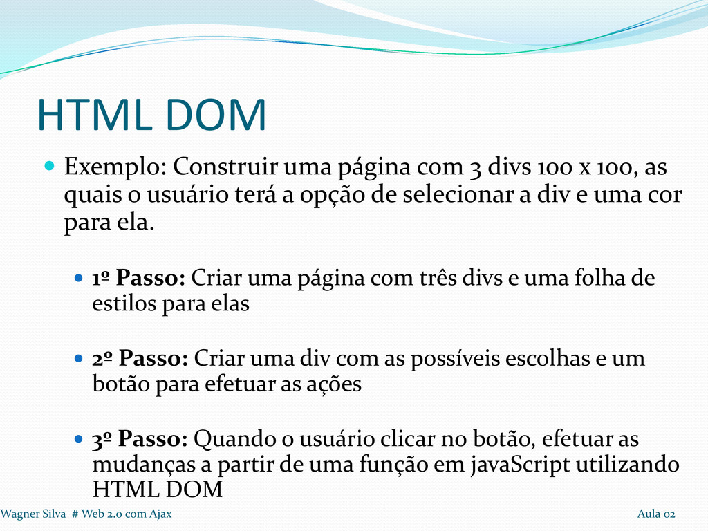 100 x 100, as quais o usuário terá a opção de selecionar a div e uma cor para ela. 1º Passo: Criar uma página com três divs e uma folha de estilos para elas 2º Passo: Criar uma div com as possíveis escolhas e um botão para efetuar as ações 3º Passo: Quando o usuário clicar no botão, efetuar as mudanças a partir de uma função em javaScript utilizando HTML DOM Wagner Silva # Web 2.0 com Ajax Aula 02