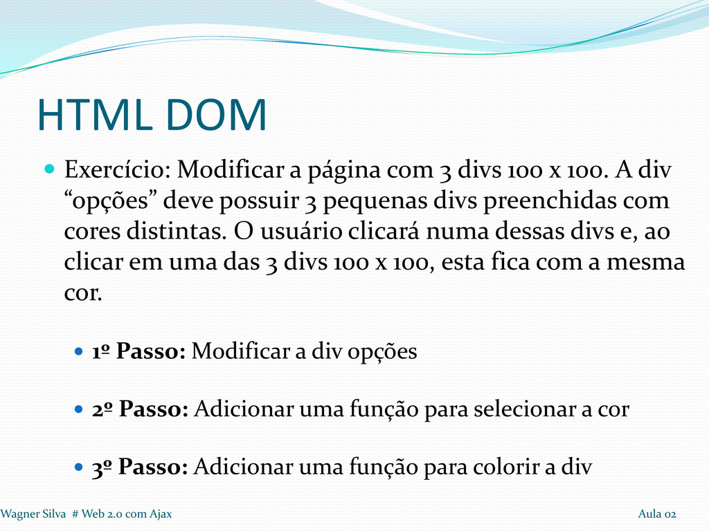 100 x 100. A div “opções” deve possuir 3 pequenas divs preenchidas com cores distintas. O usuário clicará numa dessas divs e, ao clicar em uma das 3 divs 100 x 100, esta fica com a mesma cor. 1º Passo: Modificar a div opções 2º Passo: Adicionar uma função para selecionar a cor 3º Passo: Adicionar uma função para colorir a div Wagner Silva # Web 2.0 com Ajax Aula 02